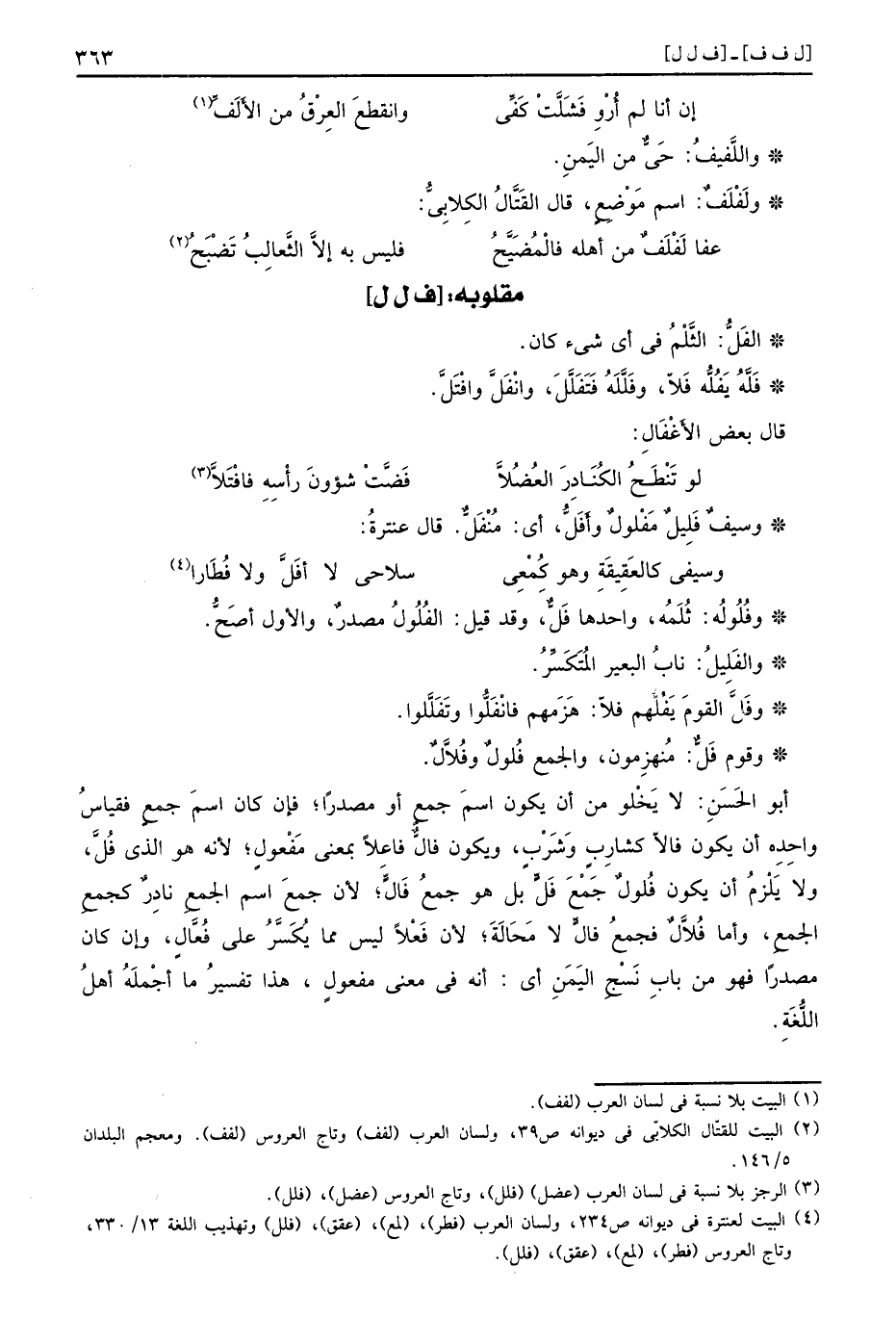 وفُلُولُه ثُلَمُه واحدها فَلٌّ وقد قيل الفُلُولُ مصدرٌ والأول أصَحُّ والفَلِيلُ نابُ البعير المُتَكَسِّرُ وفَلَّ القومَ يَفْلَّهم فلاّ هَزَمهم فانْفَلُّوا وتَفَلَّلوا وقوم فَلٌّ مُنهزِمون والجمع فُلولٌ وفُلاَّلٌ أبو الحَسَنِ لا يَخْلو من أن يكون اسمَ جمعٍ أو مصدرًا فإن كان اسمَ جمعٍ فقياسُ واحِدِهِ أن يكون فالاّ كشارِبٍ وَشَرْبٍ ويكون فالٌّ فاعِلاً بمعنى مَفْعولٍ لأنه هو الذي فُلَّ ولا يَلْزَمُ أن يكون فُلولٌ جَمْعَ فَلٍّ بل هو جمعُ فَالٍّ لأن جمعَ اسم الجمعِ نادِرٌ كجمعِ الجمعِ وأما فُلاَّلٌ فجمعُ فالٍّ لا مَحَالَةَ لأن فَعْلاً ليس مما يُكَسَّرُ على فُعَّالٍ وإن كان مصدرًا فهو من بابِ نَسْجِ اليَمَنِ أي أنه في معنى مفعولٍ هذا تفسيرُ ما أجْملَهُ أهلُ اللُّغَةِ
