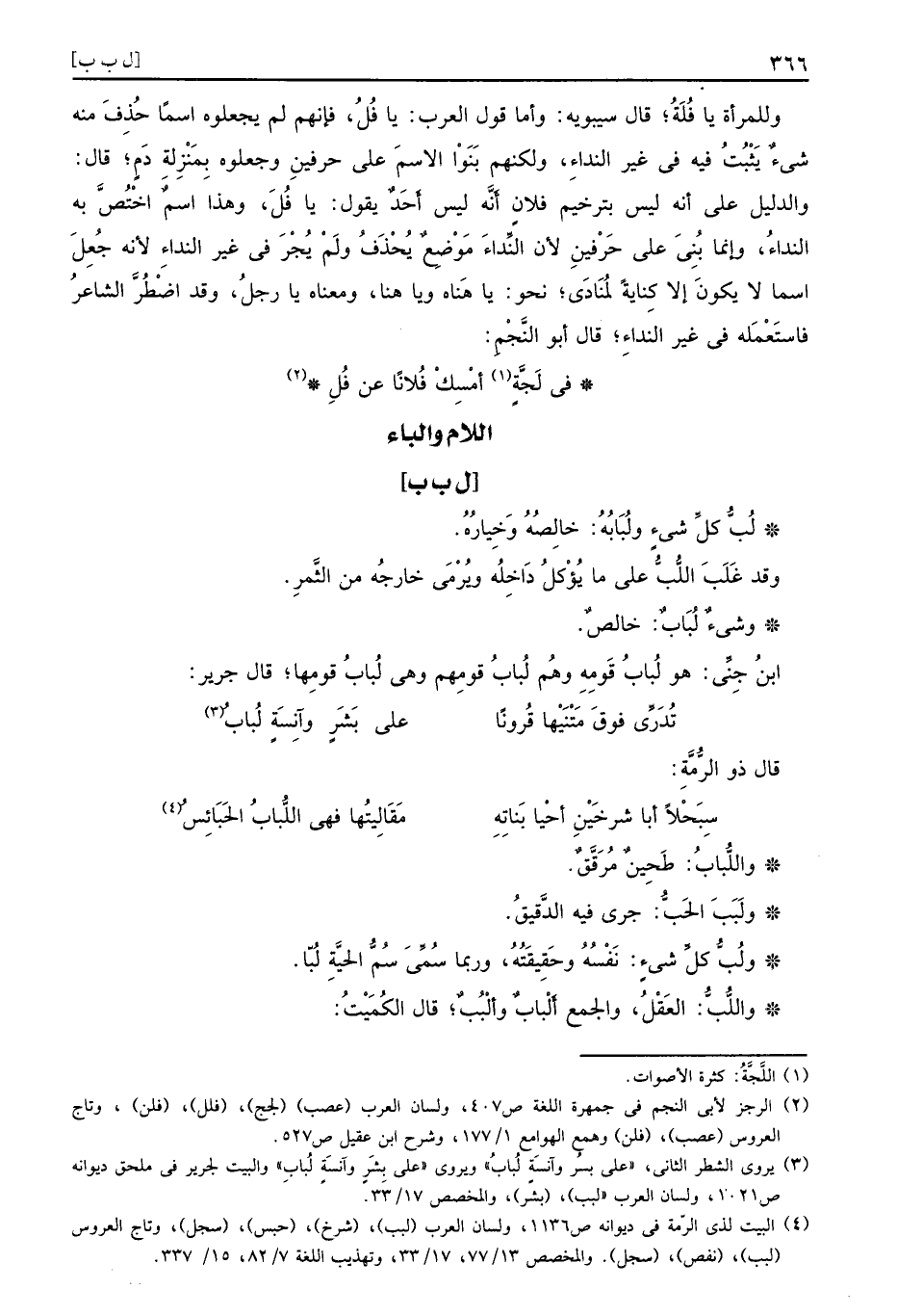 [ل ب ب] لُبُّ كلِّ شيءٍ ولُبَابُهُ خالِصُهُ وَخِيارُهُ وقد غَلَبَ اللُّبُّ على ما يُؤْكلُ دَاخِلُه ويُرْمَى خارجُه من الثَّمرِ وشيءٌ لُبَابٌ خالصٌ ابنُ جِنِّي هو لُبابُ قَومِهِ وهُم لُبابُ قومِهم وهي لُبابُ قومِها قال جرير