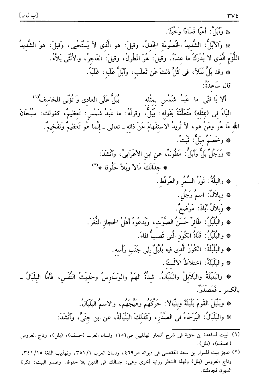 البَاءُ فِي بِمِثْلِهِ مُتَعَلِّقَةُ بَقَولِهِ يُبَلُّ وقولُهُ ما عَبدُ شَمْسٍ تَعظِيمٌ كقولك سُبْحَانَ اللهِ مَا هُو ومَنْ هو لاَ تُريدُ الاستِفهَامَ عَنْ ذاتِهِ تعالى إِنَّما هُو تَعظيمٌ وَتفْخِيمٌ وخَصْمٌ مِبَلٌّ ثَبْتٌ وَرَجُلٌ بَلٌّ وَأَبَلُّ مَطُولٌ عنِ ابنِ الأَعْرَابيِّ وَأَنْشَدَ