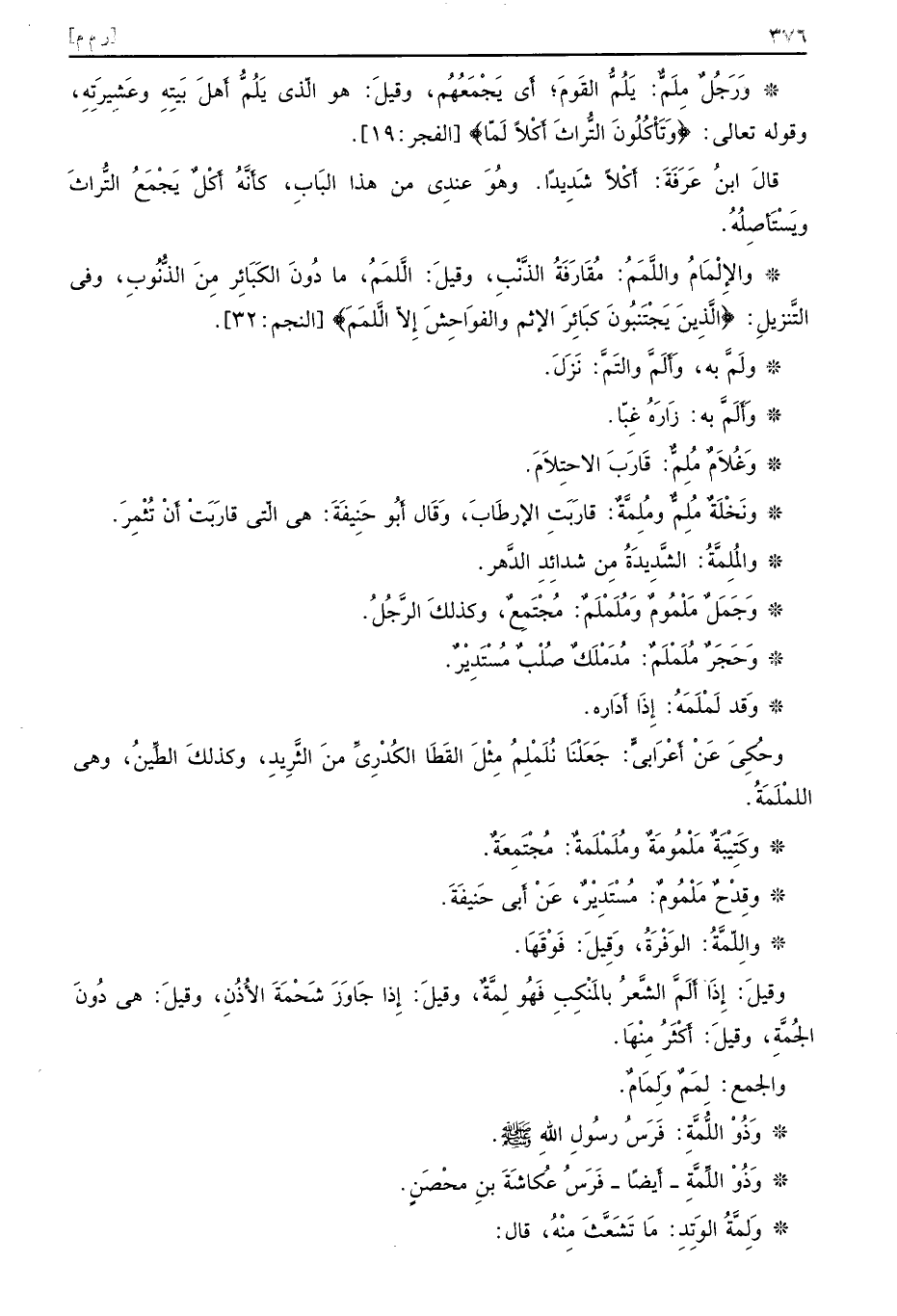 وَرَجُلٌ مِلَمٌّ يَلُمُّ القَومَ أَي يَجْمَعُهُم وقيلَ هو الَّذي يَلُمُّ أَهلَ بَيتِهِ وعَشِيرَتِهِ وقوله تعالى {وتأكلون التراث أكلا لما} الفجر 19 قالَ ابنُ عَرَفَةَ أَكْلاً شَدِيدًا وهُوَ عندِي من هذا البَابِ كأنَّهُ أَكْلٌ يَجْمَعُ التُّراثَ ويَسْتَأصِلُهُ والإِلْمَامُ واللَّمَمُ مُقَارَفَةُ الذَّنْبِ وقيلَ اللَّمَمُ ما دُونَ الكَبَائِر مِنَ الذُّنُوبِ وفي التَّنزيلِ {الذين يجتنبون كبائر الإثم والفواحش إلا اللمم} النجم 32 ولَمَّ به وَأَلَمَّ والتَمَّ نَزَلَ وَأَلَمَّ به زَارَهُ غِبّا وَغُلاَمٌ مُلِمٌّ قَارَبَ الاحتِلاَمَ ونَخْلَةٌ مُلِمٌّ ومُلِمَّةٌ قارَبَتِ الإرطَابَ وَقَال أَبُو حَنِيفَةَ هي الّتي قارَبَتْ أَنْ تُثْمِرَ والمُلِمَّةُ الشَّدِيدَةُ مِن شدائِدِ الدَّهر وجَمَلٌ مَلْمُومٌ وَمُلَمْلَمٌ مُجْتَمِعٌ وكذلكَ الرَّجُلُ وَحَجَرٌ مُلَمْلَمٌ مُدَمْلَكٌ صُلْبٌ مُسْتَدِيْرٌ وَقد لَمْلَمَهُ إِذَا أَدَاره وحُكِيَ عَنْ أَعْرَابيٍّ جَعَلْنَا نُلَمْلِمُ مِثْلَ القَطَا الكُدْرِيِّ منَ الثَّرِيدِ وكذلكَ الطِّينُ وهي اللمْلَمَةُ وكَتِيْبَةٌ مَلْمُومَةٌ ومُلَمْلَمةٌ مُجْتَمَعَةٌ ومَدْحٌ مَلْمُومٌ مُسْتَدِيْرٌ عَنْ أَبي حَنيفَةَ والِلّمَّةُ الوَفْرَةُ وَقِيلَ فَوْقَهَا وقيلَ إِذَا أَلَمَّ الشَّعرُ بالمَنْكِبِ فَهُو لِمَّةٌ وقيلَ إِذا جَاوَزَ شَحْمَةَ الأُذُنِ وقيلَ هي دُونَ الجُمَّةِ وقيلَ أكْثَرُ مِنْهَا والجمع لِمَمٌ وَلِمَامٌ وَذُوْ اللُّمَّةِ فَرَسُ رسُولِ اللهِ صلى الله عليه وسلم وَذُوْ اللِّمَّةِ أَيضًا فَرَسُ عُكاشَةَ بنِ محْصَنٍ وِلِمَّةُ الوَتِدِ مَا تَشَعَّثَ مِنْهُ قال
