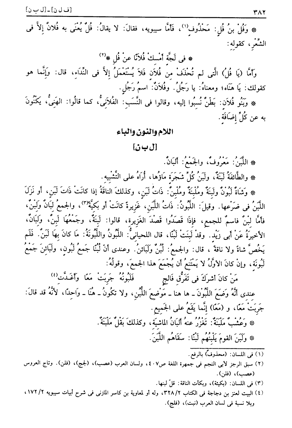 [ل ب ن] اللًّبَنُ مَعْرُوفٌ والجَمْعُ أَلبَانٌ والطَّائفَةُ لَبَنَةٌ ولَبَنٌ كُلِّ شَجَرَةٍ مَاؤُها أُرَاهُ على التَّشْبِيهِ وَشَاةٌ لَبُوْنٌ ولَبِنَةٌ ومُلْبِنَةٌ ذَاتُ لَبَنٍ وكذلكَ الناقَةُ إذا كانَتْ ذَاتَ لَبَنٍ أَو نَزَلَ اللَّبَنُ في ضَرْعها وقيلَ اللَّبُونُ ذَاتُ اللَّبَنِ غَزِيرةً كانَتْ أَو بَكِيَّةً والجمعُ لِبَانٌ وَلِبْنٌ فأَمَّا لِبْنٌ فاسمٌ للجمعِ فإِذَا قَصَدُوا قَصْدَ الغِزِيرةِ قالوا لَبِنَةٌ وجَمْعُهَا لَبِنٌ وَلِبَانٌ الأَخيرَةُ عَنْ أَبي زَيْدٍ وقدْ لَبِنَتْ لَبْنًا قال اللحيانِيُّ اللَّبُونُ واللَّبُونَةُ مَا كانَ بِهَا لَبَنٌ فَلَم يَخُصَّ شاةً ولا ناقةً قال والجمعُ لُبُنٌ ولَبَائنُ وعندي أنّ لُبُنًا جَمعُ لَبُونٍ ولَبَائِنَ جَمْعُ لَبُونَةٍ وإنْ كانَ الأوَّلُ لا يَمْتَنعُ أن يُجْمَعَ هذا الجمعَ وقولُهُ