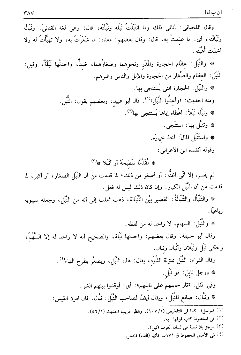 لم يفسره إلا أنّي أظنُّه أو أصغر من ذلك لما قدمت من أن النَّبَل الصغار أو أكبر لما قدمت من أن النَّبَل الكبار وإن كان ذلك ليس له فعل والتِّنْبَالُ والتِّنْبَالَةُ القصير بيِّن التِّنْبَالة ذهب ثعلب إلى أنه من النَّبَل وجعله سيبويه رباعيًا والنَّبْل السهام لا واحد له من لفظه وقال أبو حنيفة وقال بعضهم واحدتها نَبْلة والصحيح أنه لا واحد له إلا السَّهْمُ وحكى نَبْل ونَبْلان وأنْبال ونِبال وقال الفراء النَّبْل بمنزلة الذَّوْدِ يقال هذه النَّبْل ويصغَّر بطرح الهاء ورجل نابِل ذو نَبْلٍ وفي المثل ثار حابلهم على نابِلهم أي أوقدوا بينهم الشر ونبَّال صانع للنَّبْل ويقال أيضًا لصاحب النَّبْل نبَّال قال امرؤ القيس