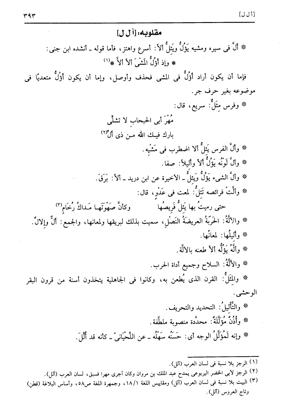 وأَلَّ الفرس يَئِلُّ ألا اضطرب في مَشْيِه وألَّ لَوْنُه يَؤُلُّ أَلاّ وأَلِيلاً صفا وألَّ الشيء يَؤُلُّ وَيئِلُّ الأخيرة عن ابن دريد ألاّ بَرَقَ وألَّتْ فرائصه تَئِلُّ لمعت في عَدْوٍ قال