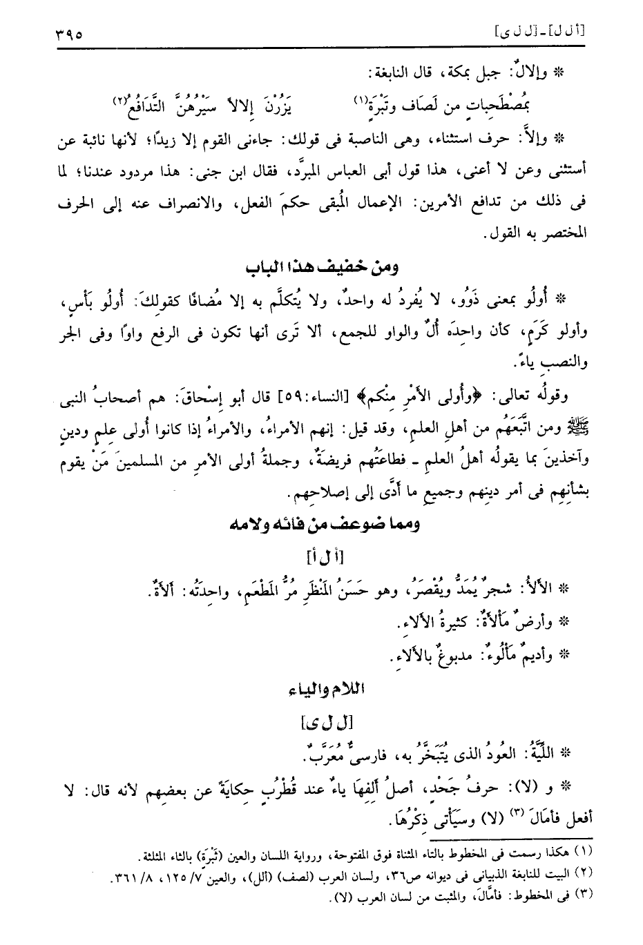 أُولُو بمعنى ذَوُو لا يُفردُ له واحدٌ ولا يُتكلَّم به إلا مُضافًا كقولِكَ أُولُو بَأْسٍ وأولو كَرَمٍ كأن واحِدَه أُلٌ والواو للجمع ألا تَرى أنها تكون في الرفع واوًا وفي الجر والنصبِ ياءً وقولُه تعالى {وأولي الأمر منكم} النساء 59 قال أبو إِسْحاقَ هم أصحابُ النبي صلى الله عليه وسلم ومن اتَّبَعَهُم من أهلِ العلمِ وقد قيل إنهم الأمراءُ والأمراءُ إذا كانوا أُولي عِلمٍ ودينٍ وآخذينَ بما يقولُه أهلُ العلمِ فطاعَتُهم فريضَةٌ وجملةُ أولي الأمرِ من المسلمينَ مَنْ يقوم بشأنِهِم في أمر دينِهم وجميعِ ما أَدَّى إلى إصلاحِهم