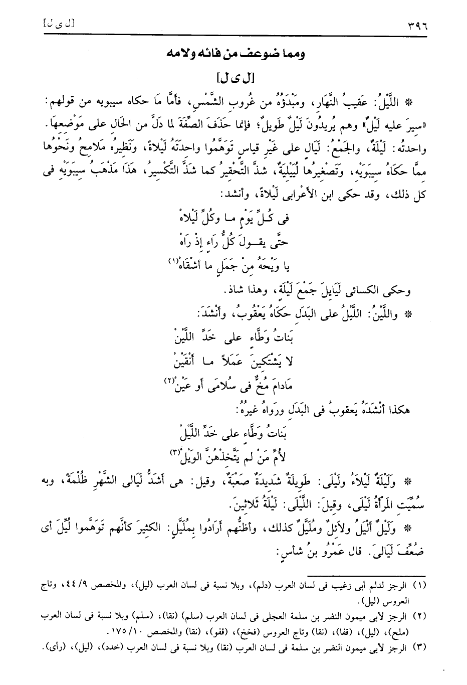 [ل ي ل] اللَّيْلُ عَقيبُ النَّهَارِ ومَبْدَؤُهُ من غُروبِ الشَّمْسِ فأَمَّا مَا حكاه سيبويه من قولهم سِيرَ عليه لَيْلٌ وهم يُريدُونَ لَيْلٌ طَويلٌ فإنما حَذَفَ الصِّفَةَ لما دَلَّ من الحَالِ على مَوْضِعِهَا واحدتُه لَيْلَةٌ والجَمْعُ لَيَالٍ على غَيْرِ قياسٍ تَوَهَّمُوا واحِدَتُه لَيْلاةً وَنَظِيرُه مَلامِحُ ونَحْوُها مِمَّا حَكَاهُ سِيبَوَيْهِ وَتَصْغِيرُها لُيَيْلِيّةٌ شذَّ التَّحْقِيرُ كما شَذَّ التَّكْسِيرُ هَذَا مَذْهَبُ سِيبَوَيْهِ في كل ذلك وقد حكى ابن الأَعْرابي لَيْلاةً وأنشد