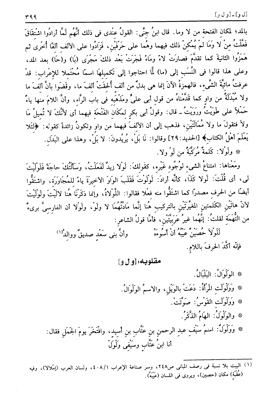 بالمد لمكانِ الفتحةِ من لا وما قال ابنُ جِنِّي القولُ عِنْدي في ذلك أنَّهُم لَمَّا أرادُوا اشْتِقَاقَ فَعَّلْتُ مِنْ لا وَمَا لمْ يُمْكِنْ ذلك فيهما وهُما على حَرْفَيْنِ فَزَادُوا على الألفِ ألِفًا أُخْرى ثم هَمَزُوا الثانيةَ كما تقدَّمَ فصارَتْ لاءً ومَاءً فَجَرَتْ بَعْد ذلكَ مَجْرَى بَا وحَا بعد المد وعلى هذا قالوا في النَّسَبِ إلى ما لمَّا احتاجوا إلى تَكمِيلِهَا اسمًا مُحْتَمِلا للإِعْرابِ قدْ عرفتُ مائِيَّةَ الشَّيءِ فالهمزةُ الآنَ إنما هي بدلٌ من ألفٍ أُلحِقَتْ ألِفَ ما وقَضَوا بأنَّ ألِفَ ما ولا مُبْدَلَةٌ من واوٍ كما قَدَّمْناهُ من قولِ أبي عليٍّ ومَذْهَبِهِ في باب الرَّاءِ وأنَّ اللامَ منها ياءٌ حَمْلاً على طَوَيْتُ ورَوَيْتُ قال وقولُ أبي بكرٍ لِمَكَانِ الفَتْحَةِ فيهما أي لأنَّكَ لا تُمِيلُ مَا ولاَ فتقولَ ما ولا مُمَالَتَيْنِ فذهب إلى أن الألِفَ فيهما من واوٍ وتكونُ زائدةً كقوله {لئلا يعلم أهل الكتاب} الحديد 29 وقالوا نَا بَلْ يُريدُونَ لا بَلْ وهذا على البَدَلِ ولَوْلا كَلمةٌ مُرَكَّبَةُ من لَوْ ولا ومَعْناهما امتناعُ الشيءِ لُوجُودِ غَيْرِه كقَولِكَ لَوْلا زيدٌ لَفَعَلْتُ وَسَأَلْتُكَ حاجَةً فَلَوْلَيْتَ لي أي قُلْتَ لَولا كَذَا كأنَّه أرادَ لَوْلَوْتَ فَقَلَبَ الوَاوَ الأخِيرَةَ ياءً للمُجَاوَرَةِ واشتَقُّوا أيضًا من الحرفِ مصدرًا كما اشتَقُّوا منه فِعْلا فقالوا اللَّوْلاةُ وإنما ذكَرْنَا هُنا لالَيْتَ ولَوْلَيْتَ لأنّ هاتَيْنِ الكَلمتينِ المغيَّرَتَيْنِ بالتركيبِ هُنا إنَّما مَادَّتُهُمَا لا ولَوْ أن الفارسِيَّ بريءٌ من التُّهْمَةِ لقلتُ إنَّهُما غيرُ عَرَبِيَّتَيْنِ فأمَّا قولُ الشاعرِ