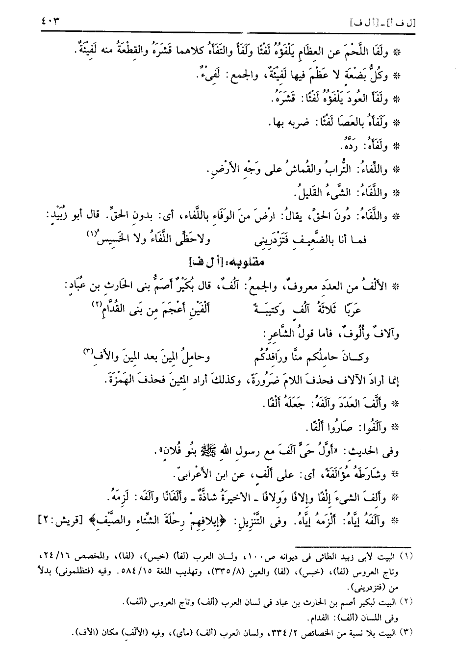 إنما أرادَ الآلاف فحذفَ اللامَ ضَرُورَةً وكذلكَ أرادَ المِئينَ فحذفَ الهَمْزَةَ وأَلَّفَ العَدَدَ وَآلَفَهُ جَعَلَهُ أَلْفًا وآلَفُوا صَارُوا أَلْفًا وفي الحديثِ أَوَّلُ حَيٍّ آلَفَ مع رسولِ اللهِ صلى الله عليه وسلم بنُو فُلانٍ وشَارَطَهُ مُؤَالَفَةً أي على أَلْفٍ عن ابن الأَعْرابيّ وأَلِفَ الشيءَ إِلْفًا وإِلافًا وَوِلافًا الأخيرَةُ شاذَّةٌ وأَلْفَانًا وآلَفَه لَزِمَهُ وآلَفَهُ إيَّاهُ أَلْزَمهُ إيَّاهُ وفي التَّنْزِيلِ {إيلافهم رحلة الشتاء والصيف} قريش 2