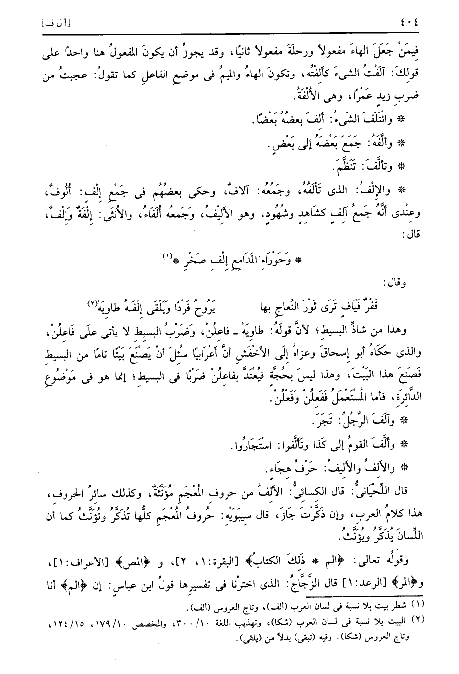 وهذا من شاذِّ البسيطِ لأنَّ قولَهُ طاوِيَهْ فاعِلُنْ وَضَرْبُ البسيطِ لا يأتي علَى فَاعِلُنْ والذي حَكَاهُ أبو إِسحاقَ وعزاهُ إِلَى الأَخْفَشِ أنَّ أَعْرَابيًا سُئِلَ أنْ يَصْنَعَ بَيْتًا تامًا من البسيطِ فَصَنعَ هذا البَيْتَ وهذا ليسَ بحُجَّةٍ فيُعْتَدَّ بفاعِلُنْ ضَرْبًا في البسيطِ إنما هو مَوْضُوعِ الدَّائِرَةِ فأما المُسْتَعْمَلُ فَفَعِلُنْ وَفَعْلُنْ وآلَفَ الرَّجُلُ تَجَرَ وأَلَّفَ القومُ إلى كَذا وتَأَلَّفوا اسْتَجَارُوا والأَلِفُ والأَلِيفُ حَرْفُ هِجَاءٍ قال اللِّحْيَانيُّ قال الكِسائيُّ الأَلِفُ من حروفِ المُعْجَمِ مُؤَنَّثَةٌ وكذلك سائِرُ الحروفِ هذا كلامُ العربِ وإن ذَكَّرْتَ جَازَ قال سِيبَوَيْهِ حُروفُ المُعْجَمِ كلُّها تُذَكَّرُ وتُؤَنَّثُ كما أن اللِّسانَ يُذَكَّرُ ويُؤَنَّثُ وقولُه تعالى {الم ذلك الكتاب} البقرة 1 2 و {المص} الأعراف 1 و {المر} الرعد 1 قال الزَّجَّاجُ الذي اخترْنا في تفسيرِها قولُ ابن عباسٍ إن {الم} أنا
