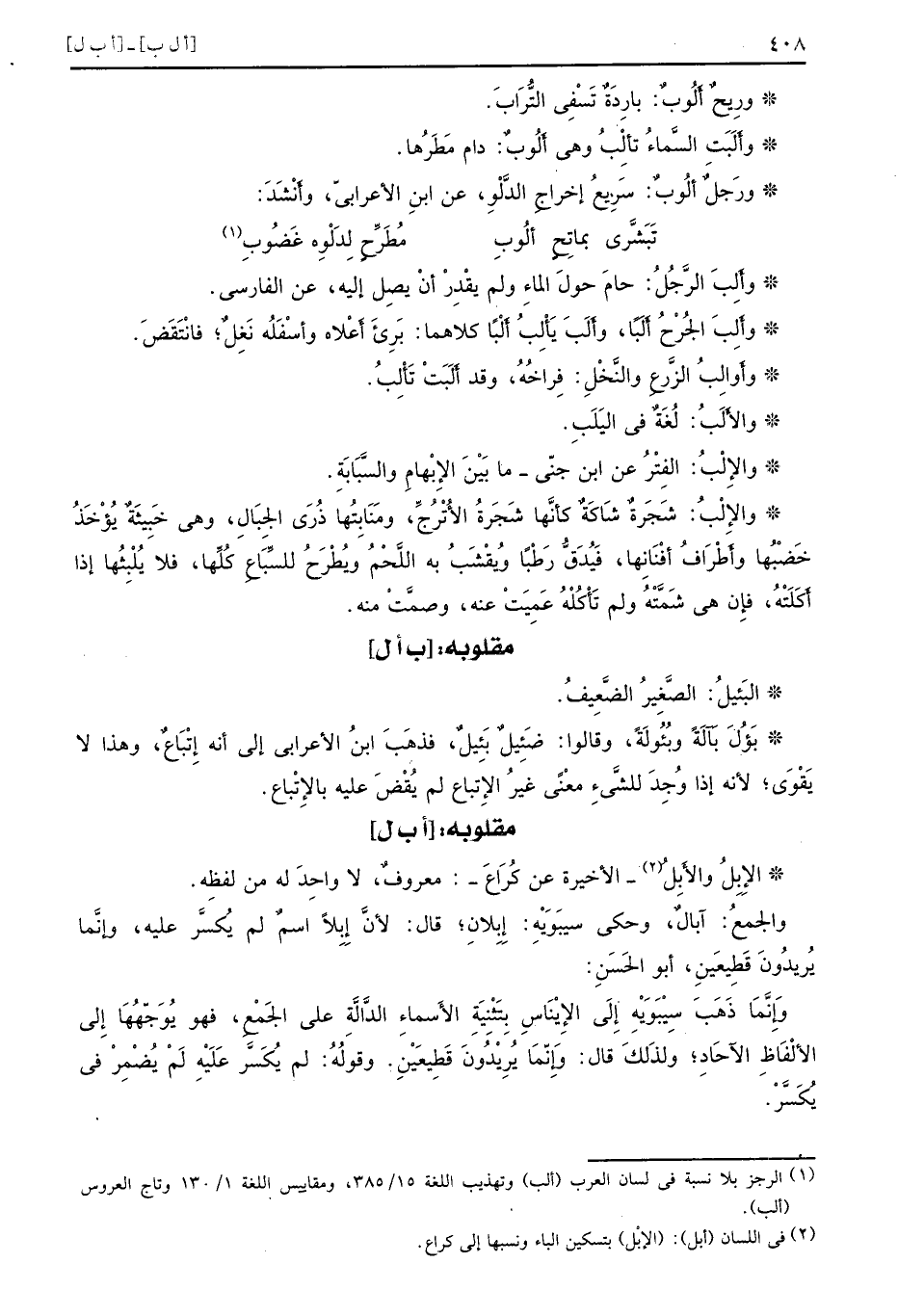 [أب ل] الإِبِلُ والأَبِلُ الأخيرة عن كُرَاعَ معروفٌ لا واحِدَ له من لفظِه والجمعُ آبالٌ وحكى سِيبَوَيْهِ إِبِلانِ قال لأنَّ إِبِلاً اسمٌ لم يُكسَّر عليه وإنَّما يُريدُونَ قَطِيعَينِ أبو الحَسَنِ وَإِنَّما ذَهَبَ سِيبَوَيْهِ إِلَى الإِيْنَاسِ بِتَثْنِيَةِ الأَسماءِ الدَّالَّةِ على الجَمْعِ فهو يُوَجِّهُهَا إلى الألْفَاظِ الآحَادِ ولذَلكَ قال وَإِنَّمَا يُرِيدُونَ قَطِيعَيْنِ وقولُهُ لم يُكَسَّر عَلَيهِ لَمْ يُضْمِرْ في يُكَسَّرْ
