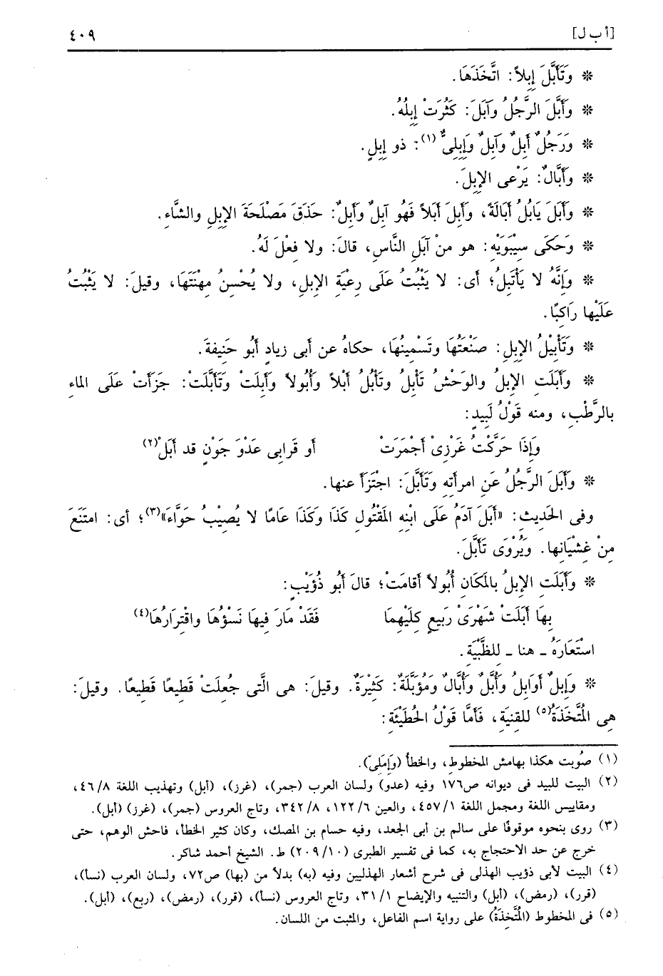 وتَأَبَّلَ إِبِلاً اتَّخَذَهَا وَأَبَّلَ الرَّجُلُ وآبَلَ كَثُرَتْ إِبِلُهُ وَرَجُلٌ أَبِلٌ وآبِلٌ وَإِبِلِيٌّ ذو إِبِلٍ وَأَبَّالٌ يَرْعَى الإِبِلَ وأَبَلَ يَابُلُ أَبَالَةً وَأَبِلَ أَبَلاً فَهُو آبِلٌ وَأَبِلٌ حَذَقَ مَصْلَحَة الإِبِلِ والشَّاءِ وَحَكَى سِيبَوَيْهِ هو منْ آبَلِ النَّاسِ قالَ ولا فِعْلَ لَهُ وَإِنَّهُ لا يَأْتَبِلُ أَي لا يَثْبُتُ عَلَى رِعْيَةِ الإِبلِ ولا يُحْسِنُ مِهْنَتَها وقيلَ لا يَثْبُتُ عَلَيْها رَاكِبًا وَتَأْبِيْلُ الإِبِلِ صَنْعَتُهَا وتَسْمِينُهَا حكاهُ عن أَبي زيادٍ أَبُو حَنِيفَةَ وَأَبَلَتِ الإِبِلُ والوَحْشُ تَأْبِلُ وتَأْبُلُ أَبْلاً وَأُبُولاً وَأَبِلَتْ وَتَأَبَّلَتْ جَزَأَتْ عَلَى الماءِ بالرَّطْبِ ومنه قَوْلُ لَبِيدٍ