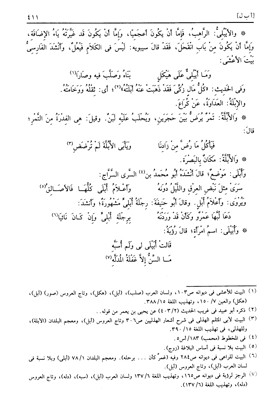 وَفي الحَدِيثِ كُلُّ مَالٍ زُكِّيَ فَقَدْ ذَهَبَتْ عَنْهُ أَبَلَتُهُ أَي ثِقْلُهُ وَوَخَامَتُهُ والإِبْلَةُ العَدَاوَةُ عَنْ كُرَاعَ وَالأُبُلَّةُ تَمْرٌ يُرَضُّ بَيْنَ حَجَرَينِ وَيُحْلَبُ عَلَيْهِ لَبَنٌ وقيلَ هِي الفِدْرَةُ مِنَ التَّمْرِ قالَ