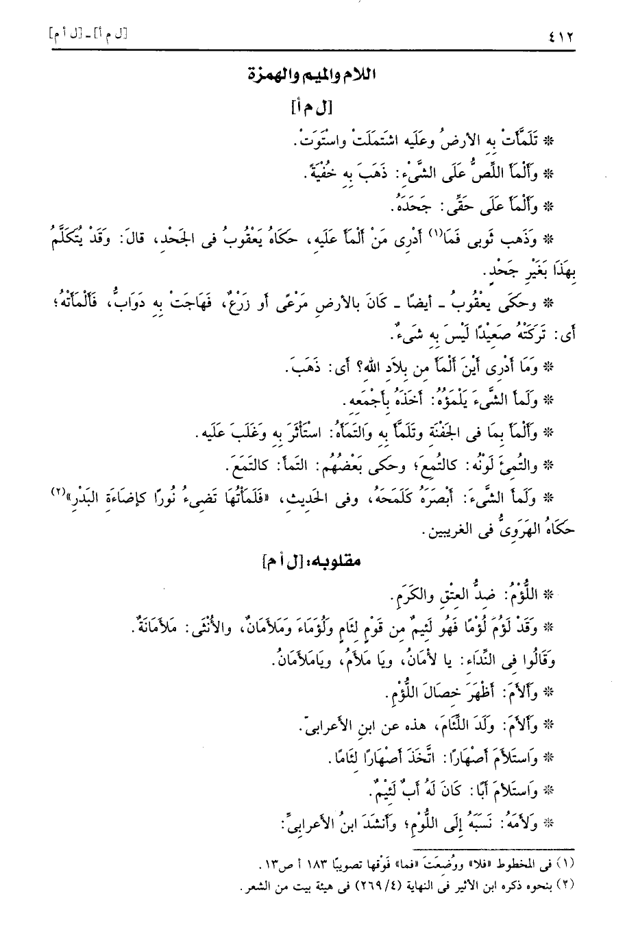 [ل م أ] تَلَمَّأَتْ بِهِ الأرضُ وعَلَيه اشتَمَلَتْ واسْتَوَتْ وَأَلْمَأَ اللِّصُّ عَلَى الشَّيْءِ ذَهَبَ بِهِ خُفْيَةً وَأَلْمَأَ عَلَى حَقِّي جَحَدَهُ وَذَهب ثَوبي فَمَا أَدْرِي مَنْ أَلْمَأَ عَلَيهِ حَكَاهُ يَعْقُوبُ في الجَحْدِ قالَ وَقَدْ يُتَكَلَّمُ بِهَذَا بَغَيْرِ جَحْدٍ وحَكَى يعْقُوبُ أيضًا كَانَ بالأرضِ مَرْعًى أَو زَرْعٌ فَهَاجَتْ بِهِ دَوَابُّ فَأَلْمَأَتْهُ أَي تَرَكَتْهُ صَعِيدًا لَيْسَ بِهِ شَيءٌ وَمَا أَدْرِي أَيْنَ أَلْمَأَ مِن بِلاَدِ اللهِ أي ذَهَبَ وَلَمأَ الشَّيءَ يَلْمَؤُهُ أَخَذَهُ بِأَجْمَعِهِ وَأَلْمَأَ بِمَا في الجَفْنَةِ وَتَلَمَّأَ بِهِ وَالتَمَأَهُ اسْتَأَثَرَ بِهِ وَغَلَبَ عَلَيه والتُمِئَ لَوْنُه كالتُمِعَ وحَكى بَعْضُهُم التَمأَ كالتَمَعَ وَلَمأ الشَّيءَ أَبْصَرُه كَلَمَحَهُ وفي الحَدِيثِ فَلَمَأْتُهَا تَضِيءُ نُورًا كإضَاءَةِ البَدْرِ حَكَاهُ الهَرَوِيُّ في الغريبين