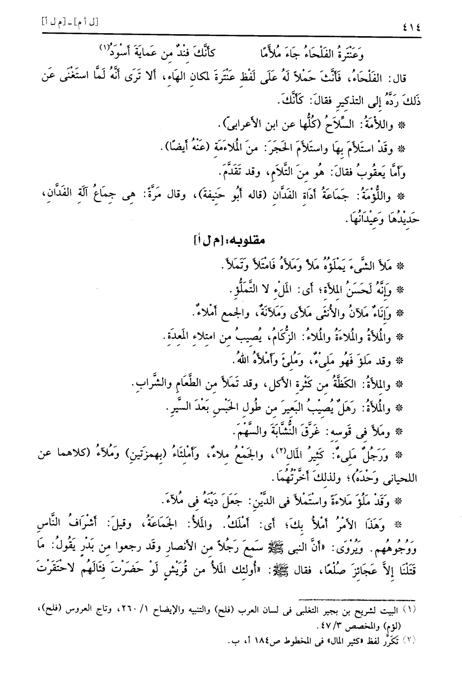 قال الفَلْحَاءُ فأَنَّثَ حَمْلاً لَهُ عَلَى لَفْظِ عَنْتَرَةَ لمكانِ الهَاءِ أَلا تَرَى أَنَّهُ لَمَّا استَغْنَى عَن ذَلكَ رَدَّهُ إِلى التذكِيرِ فقالَ كَأَنَّكَ واللأْمَةُ السِّلاَحُ كُلُّها عن ابن الأعرابي وقَدْ استَلأَمَ بِهَا واستَلأَمَ الحَجَرَ منَ المُلاءَمَةِ عَنْهُ أَيضًا وَأَمَّا يَعقُوبُ فقالَ هُو مِنَ التَّلاَمِ وقد تَقَدَّمَ واللُّؤْمَةُ جَمَاعَةُ أَدَاةِ الفَدَّانِ قاله أَبُو حِنِيفة وقال مَرَّةً هِي جِمَاعُ آلَةِ الفَدَّانِ حَدِيْدُهَا وَعِيْدَانُهَا