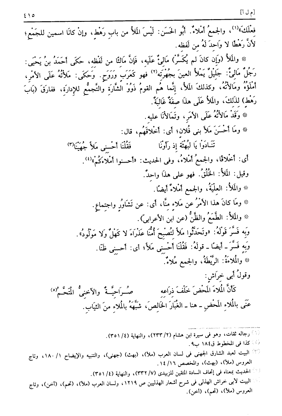 أَي أَخْلاقًا والجمعُ أَمْلاءُ وفي الحديث أَحسنوا أَمْلاءَكُمْ وقيل المَلأُ الخُلُقُ فهو على هذَا واحِدٌ والمَلأُ العِلْيَةُ والجمع أَمْلاءٌ أَيضًا ومَا كانَ هذا الأَمْرُ عن مَلاءٍ مِنَّا أَي عن تَشَاوُرٍ واجتِماعٍ والمَلأُ الطَّمَعُ والظَّنُّ عن ابن الأَعرابيّ وَبِه فَسَّرَ قَوْلَهُ وتَحَدَّثُوا مَلأً لِتُصْبَحَ أُمَّنَا عَذْرَاءَ لا كَهْلٌ وَلا مَوْلُودُ وَبِهِ فَسَّرَ أَيضًا قولَهُ فَقُلْنَا أَحْسِنِي مَلأً أي أَحسِنِي ظَنّا والمُلاءَةُ الرَّيْطَةُ والجمع مُلاءٌ وقولُ أَبي خِرَاشٍ