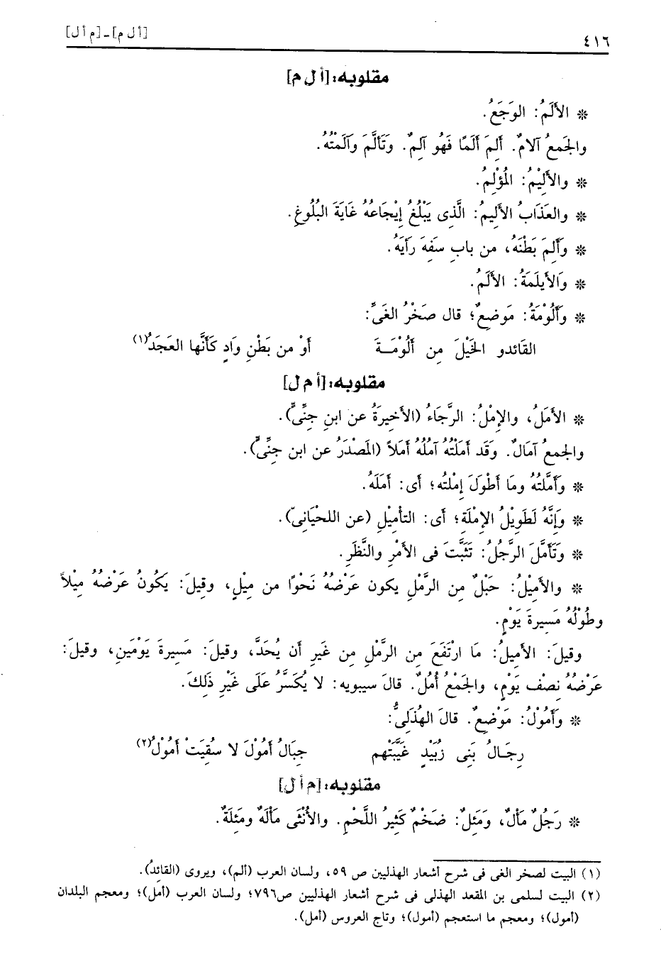 [أم ل] الأَمَلُ والإِمْلُ الرَّجَاءُ الأَخِيرَةُ عن ابنِ جِنِّيٍّ والجمعُ آمَالٌ وَقَد أَمَلْتُهُ آمُلُهُ أَمَلاً المَصْدَرُ عن ابن جِنِّيٍّ وَأَمَّلتُهُ ومَا أَطْوَلَ إِمْلتُه أَي أَمَلَهُ وَإِنَّهُ لَطَوِيْلُ الإِمْلَةِ أَي التأْمِيْلِ عن اللحْيَانِيّ وَتَأَمَّلَ الرَّجُلُ تَثَبَّتَ في الأَمْرِ والنَّظَرِ والأَمِيْلُ حَبْلٌ مِن الرَّمْلِ يكون عَرْضُهُ نَحْوًا من مِيْلٍ وقِيلَ يَكُونُ عَرْضُهُ مِيْلاً وطُوْلُهُ مَسِيرةَ يَوْمٍ وقيلَ الأَمِيلُ مَا ارْتَفَعَ مِن الرَّمْلِ مِن غِيرِ أَن يُحَدَّ وقيلَ مَسِيرةَ يَوْمَينِ وقيلَ عَرْضُهُ نِصفُ يَوْمٍ والجَمْعُ أُمُلٌ قالَ سيبويه لا يُكَسَّرُ عَلَى غَيْرِ ذَلِكَ وَأَمُوْلُ مَوْضِعٌ قالَ الهُذَلِيُّ