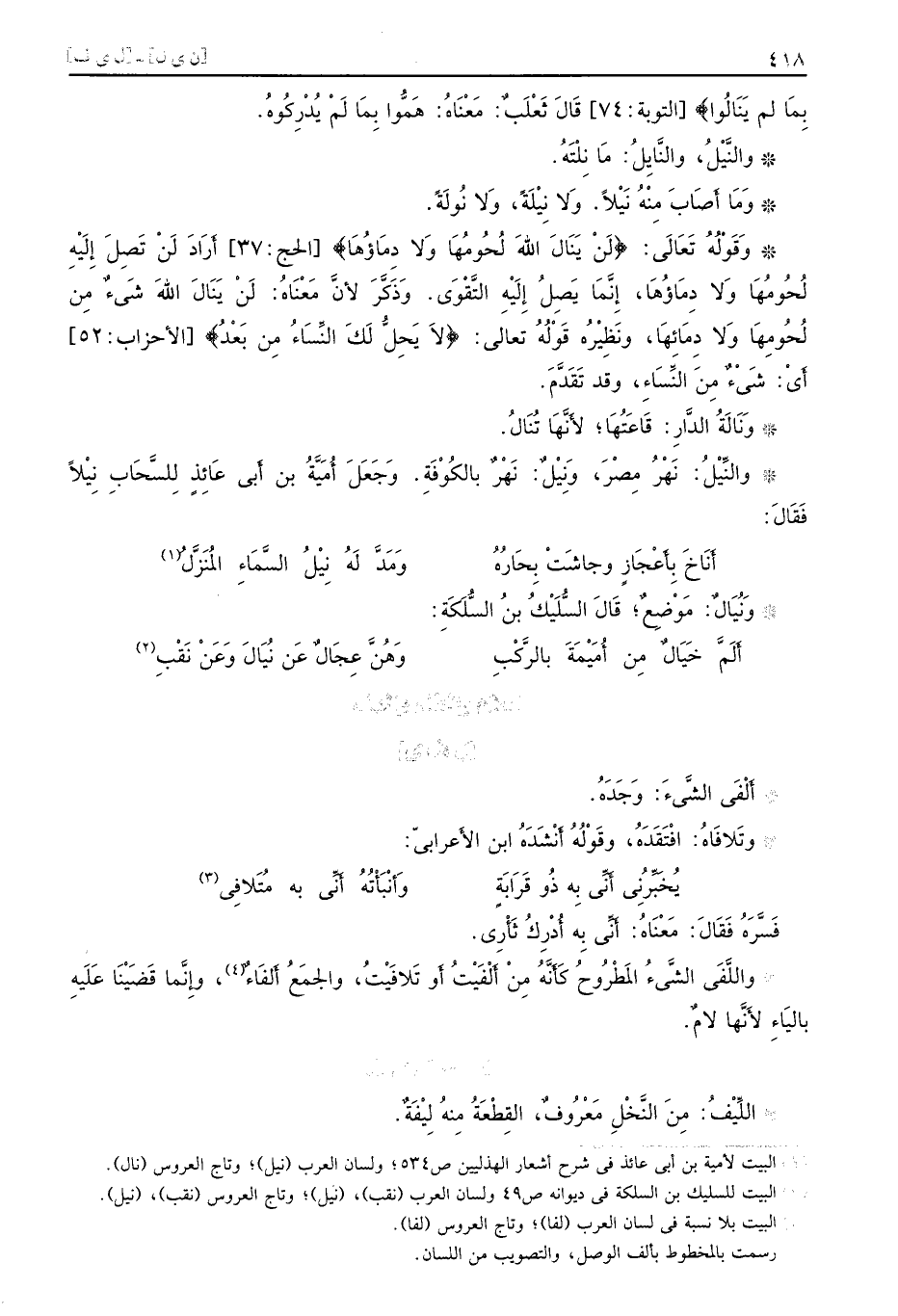بِمَا لم يَنَالُوا} التوبة 74 قَالَ ثَعْلَبٌ مَعْنَاهُ هَمُّوا بِمَا لَمْ يُدْرِكُوُه والنَّيْلُ والنَّايِلُ مَا نِلْتَهُ وَمَا أَصَابَ مِنْهُ نَيْلاً وَلا نِيْلَةً وَلا نُولَةً وَقَوْلُهُ تَعَالَى {لَنْ يَنَالَ اللهَ لُحُومُهَا وَلا دِمَاؤُهَا} الحج 37 أَرَادَ لَنْ تَصِلَ إِلَيْهِ لُحُومُهَا وَلا دِمَاؤُهَا إِنَّمَا يَصِلُ إِلَيْهِ التَّقْوَى وَذَكَّرَ لأنَّ مَعْنَاهُ لَنْ يَنَالَ اللهَ شَيءٌ مِن لُحُومِهَا وَلا دِمَائِهَا ونَظِيْرُه قَوْلُهُ تعالى {لاَ يَحِلُّ لَكَ النِّسَاءُ مِن بَعْدُ} الأحزاب 52 أَيْ شَيْءٌ مِنَ النِّسَاءِ وقد تَقَدَّمَ وَنَالَةُ الدَّارِ قَاعَتُهَا لأَنَّهَا تُنَالُ والنِّيْلُ نَهْرُ مِصْرَ وَنِيْلٌ نَهْرٌ بالكُوْفَةِ وَجَعَلَ أُمَيَّةُ بن أَبي عَائِذٍ لِلسَّحَابِ نِيْلاً فَقَالَ