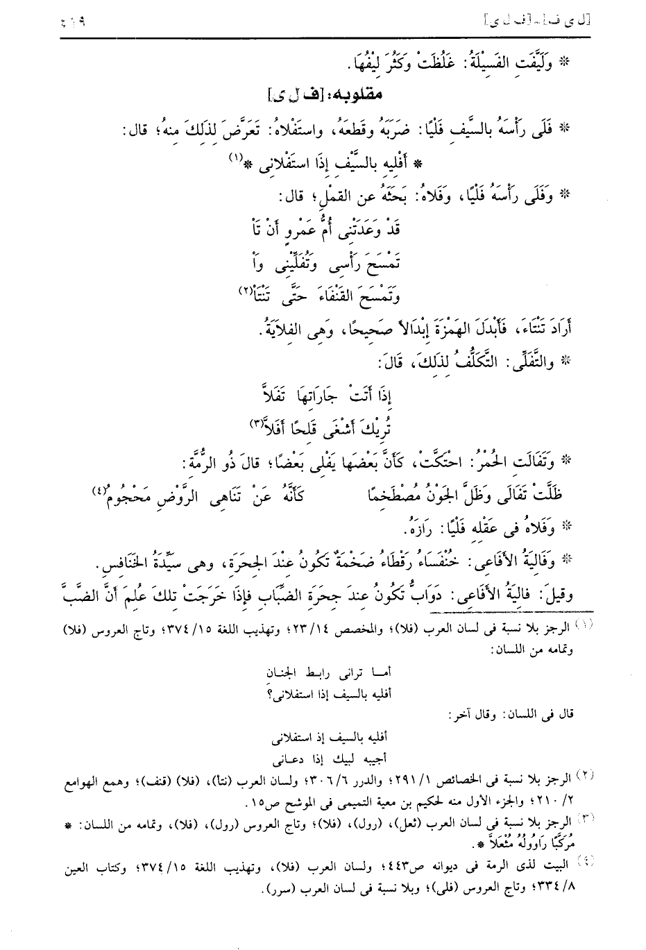 [ف ل ي] فَلَى رَأْسَهُ بالسَّيفِ فَلْيًا ضَرَبَهُ وقَطعَهُ واستَفْلاهُ تَعَرَّضَ لِذلِكَ مِنهُ قال
