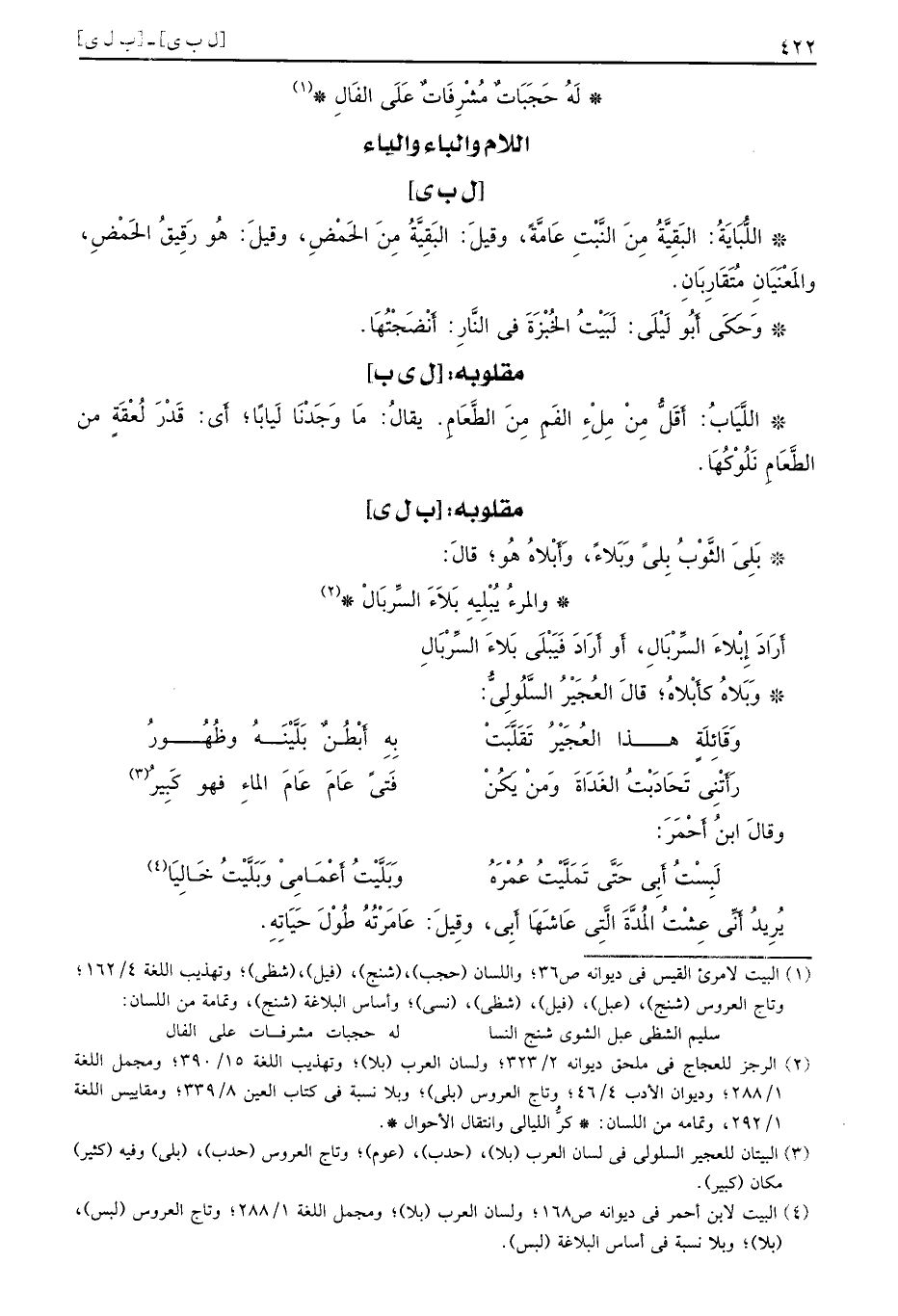 [ل ب ي] اللُّبَايَةُ البَقِيَّةُ مِنَ النَّبْتِ عَامَّةً وقيلَ البَقِيَّةُ مِنَ الحَمْضِ وقيلَ هُو رَقِيقُ الحَمْضِ والمَعْنَيَانِ مُتَقَارِبَانِ وَحَكَى أَبُو لَيْلَى لَبَيْتُ الخُبُزَةَ في النَّارِ أَنْضَجْتُهَا
