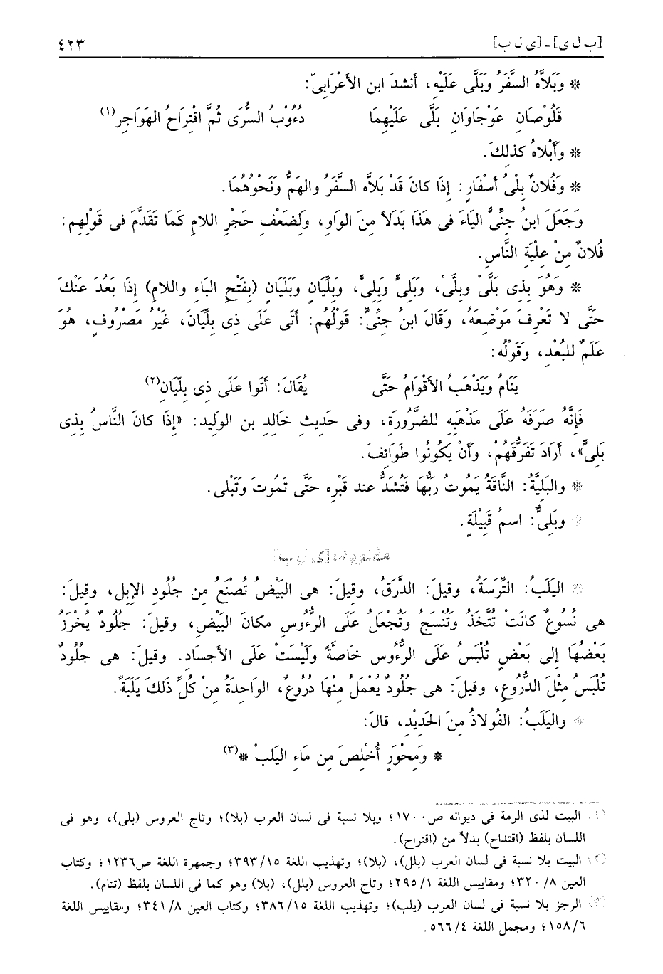 وَأَبْلاهُ كذلِكَ وَفُلانٌ بِلْيُ أَسْفَارٍ إِذَا كانَ قَدْ بَلاَّه السَّفَرُ والهَمُّ وَنَحْوُهُمَا وَجَعَلَ ابنُ جِنِّيٍّ اليَاءَ في هَذَا بَدَلاً مِنَ الوَاوِ وَلِضَعْفِ حَجْرِ اللامِ كَمَا تَقَدَّمَ في قَوْلِهِم فُلانٌ مِنْ عِلْيَةِ النَّاسِ وَهُوَ بِذِي بَلَّيْ وبِلَّيْ وَبَلِيٍّ وَبِلِيٍّ وَبِلِّيَانٍ وَبَلَيَانٍ بِفَتْحِ البَاءِ واللامِ إِذَا بَعُدَ عَنْكَ حَتَّى لا تَعْرِفَ مَوْضِعَهُ وَقَالَ ابنُ جِنِّيٍّ قَوْلُهُم أَتَى عَلَى ذِي بِلِّيَانَ غَيْرُ مَصْرُوفٍ هُوَ عَلَمٌ للبُعْدِ وَقَوْلُه