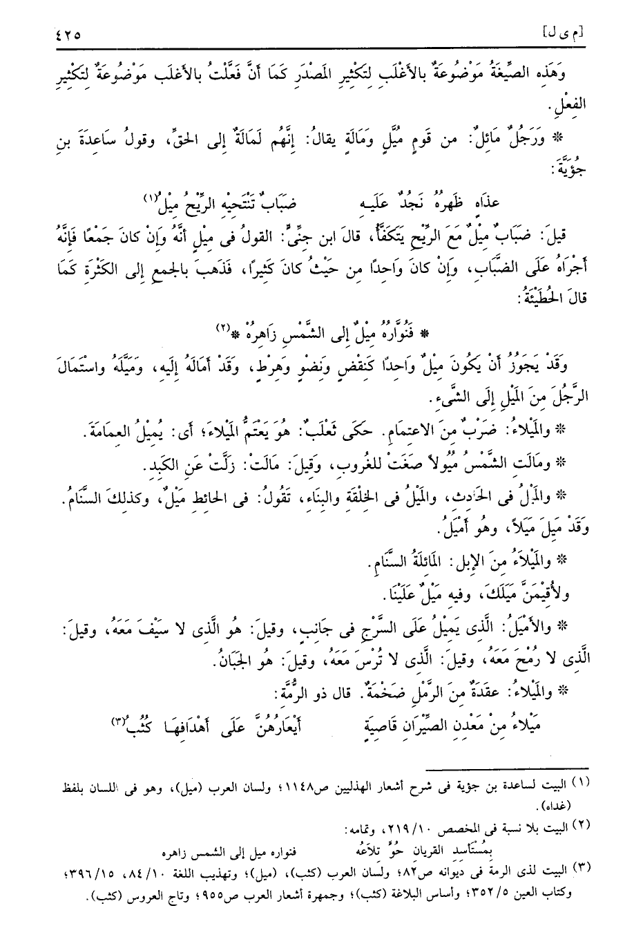 وَقَدْ يَجُوزُ أَنْ يَكُونَ مِيْلٌ وَاحِدًا كَنِقْضٍ وَنِضْوٍ وَهِرْطٍ وَقَدْ أَمَالَهُ إِلَيهِ وَمَيَّلَهُ واسْتَمَالَ الرَّجُلَ مِنَ المَيْلِ إِلَى الشَّيءِ والمَيْلاءُ ضَرْبٌ مِنَ الاعتِمَامِ حَكَى ثَعْلَبٌ هُوَ يَعْتَمُّ المَيْلاءَ أَي يُمِيْلُ العِمَامَةَ ومَالَتِ الشَّمْسُ مُيُولاً صَغَتْ للغُروبِ وَقِيلَ مَالَتْ زَلَّتْ عَنِ الكَبِدِ والمَيْلُ في الحَدِثِ والمَيْلُ في الخِلْقَةِ والبِنَاءِ تَقُولُ في الحائِطِ مَيْلٌ وكذلِكَ السَّنَامُ وَقَدْ مَيِلاً وهُو أَمْيَلُ والمَيْلاَءُ مِنَ الإِبِل المَائِلَةُ السَّنَامِ ولأُقِيْمَنَّ مَيَلَكَ وفيهِ مَيْلٌ عَلَيْنَا والأَمْيَلُ الَّذِي يَمِيْلُ عَلَى السَّرْجِ في جَانِبٍ وقيلَ هُو الَّذِي لا سَيْفَ مَعَهُ وقيلَ الَّذِي لا رُمْحَ مَعَهُ وقيلَ الَّذِي لا تُرْسَ مَعَهُ وقيلَ هُو الجَبَانُ والمَيْلاءُ عقَدَةٌ مِنَ الرَّمْلِ ضَخْمَةٌ قال ذو الرُّمَّةِ
