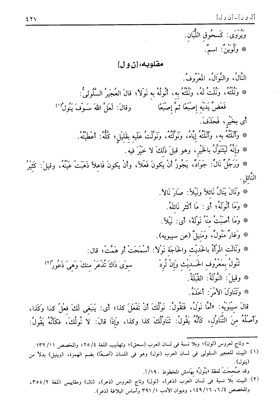 أَي بخَيْرٍ فَحَذَفَ وَأَنَلْتُهُ بهِ وَأَنَلْتُهُ إِيَّاهُ وَنَوَّلْتُهُ وَنَوَّلْتُ عَلَيهِ بِقَلِيْلٍ كُلُّهُ أَعْطَيْتُهُ وَإِنَّهُ لَيَتَنَوَّلُ بالخَيْرِ وهو قبلَ ذَلِكَ لا خَيْرَ فيه وَرَجُلٌ نَالٌ جَوَادٌ يَجُوزُ أَنْ يكونَ فَعْلاً وأَنْ يكونَ فَاعِلاً ذَهَبَتْ عَيْنُهُ وقيلَ كَثِيْرُ النَّائِلِ وَنَالَ يَنَالُ نَائِلاً وَنَيْلاً صَارَ نَالاً وَمَا أَنْوَلَهُ أَي مَا أَكْثر نَائِلَهُ وَمَا أَصَبْتُ مِنْهُ نَوْلَةً أَي نَيْلاً وَغارٌ مَنُولٌ وَمَنِيلٌ عن سيبويه وَنَالَتِ المَرْأَةُ بالحَدِيْثِ والحَاجَةِ نَوْلاً أَسْمَحَتْ أَو هَمَّتْ قال