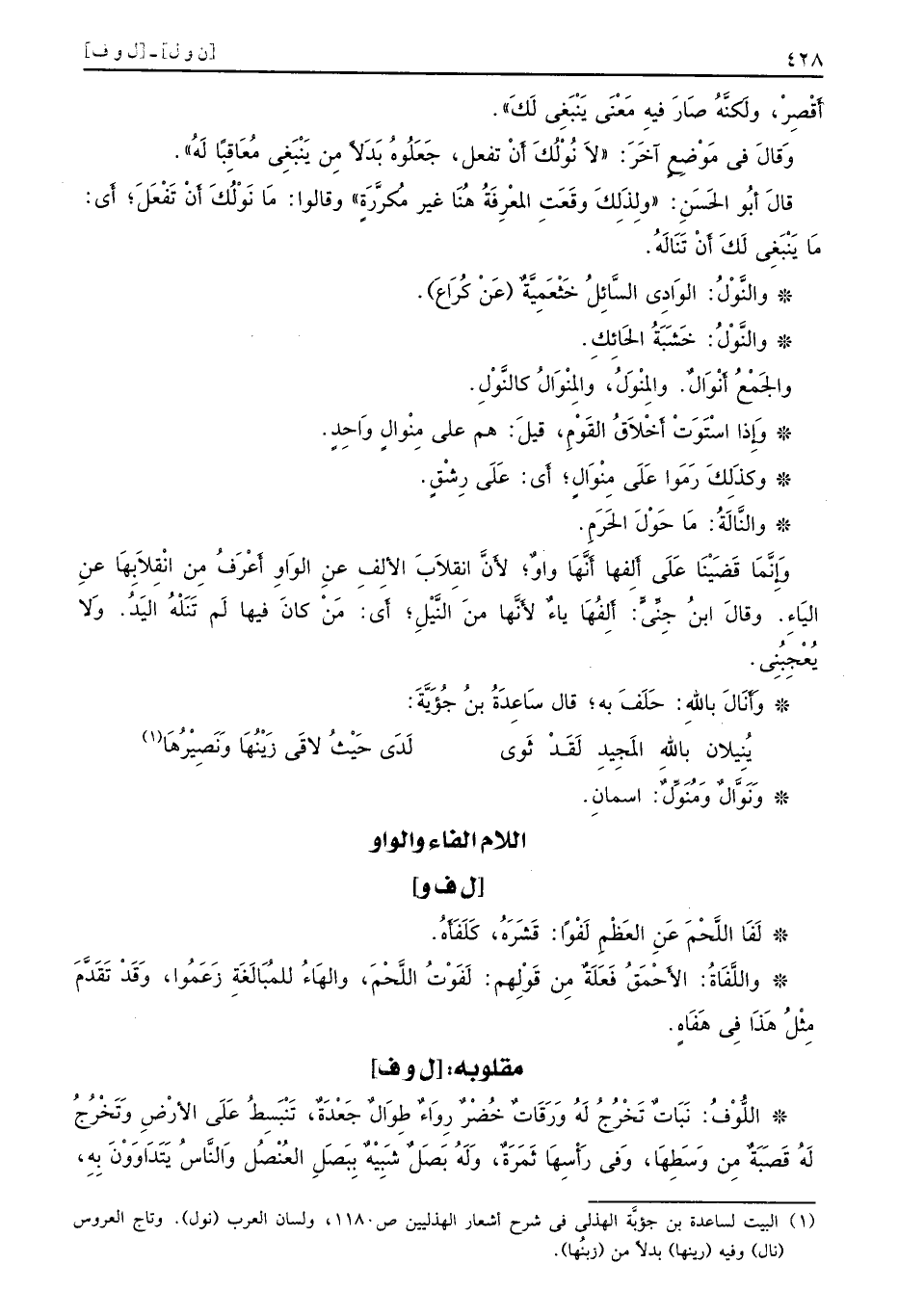 أَقْصِرْ وَلكنَّهُ صَارَ فيهِ مَعْنَى يَنْبَغِي لَكَ وَقالَ في مَوْضِعٍ آَخَرَ لاَ نُوْلُكَ أَنْ تفعل جَعَلُوهُ بَدَلاً مِن يَنْبَغِي مُعَاقِبًا لَهُ قالَ أَبُو الحَسَنِ ولِذَلِكَ وقَعَتِ المعْرِفَةُ هُنَا غير مُكرَّرَةٍ وقالوا مَا نَوْلُكَ أَنْ تَفْعَلَ أَي مَا يَنْبَغِي لَكَ أَنْ تَنَالَهُ والنَّوْلُ الوَادِي السَّائِلُ خَثْعَمِيَّةٌ عَنْ كُرَاعَ والنَّوْلُ خَشَبَةُ الحَائِكِ والجَمْعُ أَنْوَالٌ والمِنْوَلُ والمِنْوَالُ كالنَّوْلِ وَإِذَا اسْتَوَتْ أَخْلاَقُ القَوْمِ قيلَ هم على مِنْوالٍ وَاحِدٍ وكذَلِكَ رَمَوا عَلَى مِنْوَالٍ أَي عَلَى رِشْقٍ والنَّالَةُ مَا حَوْلَ الحَرَمِ وَإِنَّمَا قَضَيْنَا عَلَى أَلِفها أَنَّهَا واوٌ لأنَّ انقِلاَبَ الألِفِ عنِ الوَاوِ أَعْرِفُ مِن انْقِلاَبِهَا عِن اليَاءِ وقالَ ابنُ جِنِّيٍّ أَلِفُهَا ياءٌ لأَنَّها منَ النَّيْلِ أَي مَنْ كانَ فيها لَم تَنَلْهُ اليَدُ وَلا يُعْجِبُنِي وأَنَالَ باللهِ حَلَفَ به قال سَاعِدَةُ بنُ جُؤَيَّةَ