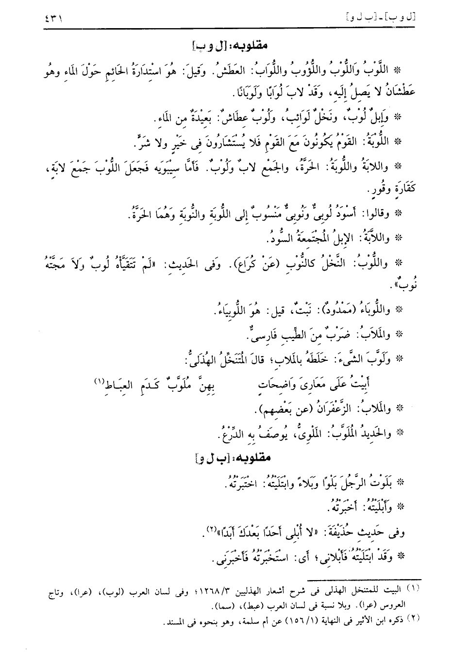 [ل وب] اللَّوْبُ وَاللُّوْبُ واللُّؤُوبُ واللُّوَابُ العَطَشُ وَقيلَ هُوَ اسْتِدَارَةُ الحَائِمِ حَوْلَ المَاءِ وهُو عَطْشَانُ لا يَصِلُ إِلَيهِ وَقَدْ لابَ لُوَابًا وَلَوَبَانًا وَإِبِلٌ لُوْبٌ ونَخْلٌ لَوَائِبُ وَلُوْبٌ عِطَاشٌ بَعِيْدَةٌ مِن المَاءِ اللُّوْبَةُ القَوْمُ يَكُونُونَ مَعَ القَوْمِ فَلا يُسْتَشَارُونَ فِي خَيْرٍ ولا شَرٍّ واللابَةُ واللُّوبَةُ الحَرَّةُ والجَمْع لابٌ وَلُوْبٌ فَأَمَّا سِيْبَوَيه فَجَعَلَ اللُّوْبَ جَمْعَ لابَةٍ كَقَارَةٍ وقُورٍ وقالوا أَسْوَدُ لُوبِيٌّ وَنُوبِيٌّ مَنْسُوبٌ إِلى اللُّوبَةِ والنُّوبَةِ وَهُمَا الحَرَّةُ واللاَّبَةُ الإِبلُ المُجْتَمِعَةُ السُّودُ واللُّوْبُ النَّخْلُ كالنُّوْبِ عَنْ كُرَاع وَفي الحَدِيثِ لَمْ تَتَفَيَّأَهُ لُوبٌ وَلاَ مَجَّتْهُ نُوبٌ واللُّوبَاءُ مَمْدودٌ نَبْتٌ قيل هُوَ اللُّوبِيَاءُ والمَلاَبُ ضَرْبٌ مِنَ الطِّيبِ فَارِسيٌّ وَلَوَّبَ الشَّيءَ خَلَطَه بالمَلابِ قالَ المُتَنَخِّلُ الهُذَليُّ