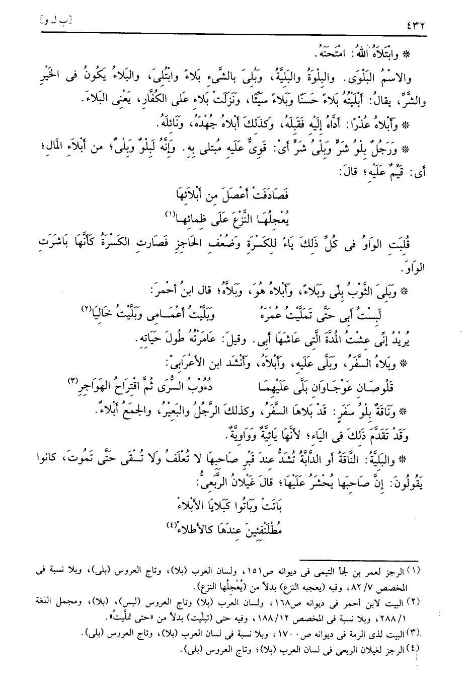 وابْتَلاهُ اللهُ امْتَحَنَهُ والاسْمُ البَلْوَى والبِلْوَةُ والبَلِيَّةُ وَبُلِيَ بالشَّيءِ بَلاءً وابْتُلِيَ والبَلاءُ يَكُونُ في الخَيْرِ والشَّرَّ يقالُ أَبْلَيْتُهُ بَلاءً حَسَنًا وَبَلاءً سَيِّئًا وَنَزَلَتْ بَلاءِ عَلى الكُفَّارِ يَعْنِي البَلاءَ وَأَبْلاهُ عُذْرًا أَدَّاهُ إِلَيْهِ فَقَبِلَهُ وَكذلِكَ أَبْلاهُ جُهْدَهُ وَنَائِلَهُ وَرَجُلٌ بِلْوُ شَرٍّ وَبِلْيُ شَرٍّ أَيْ قَوِيٌّ عَلَيهِ مُبتلى بِهِ وَإِنَّهُ لَبِلْوٌ وَبِلْيٌ من أَبْلاَءِ المَالِ أَي قَيِّمٌ عَلَيْهِ قالَ