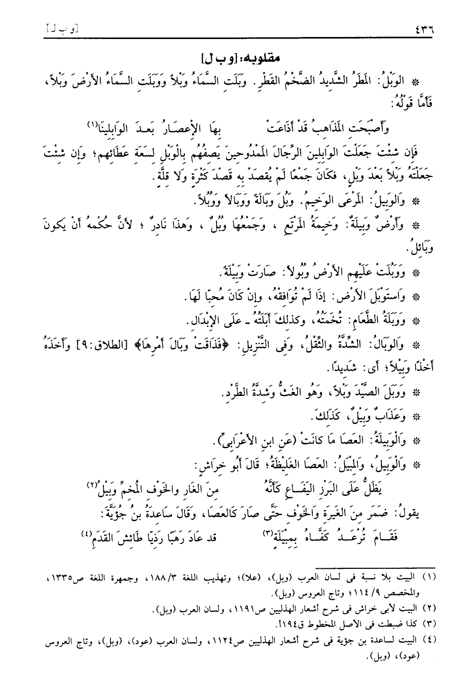 فَإِن شِئْتَ جَعَلْتَ الوَابِلِينَ الرِّجَالَ المَمْدُوحِينَ يَصِفُهُم بِالْوَبْلِ لِسَعَةِ عَطَائِهم وَإِن شِئْتَ جَعَلْتَهُ وَبْلاً بَعْدَ وَبْلٍ فكَانَ جَمْعًا لَمْ يُقصَدْ بِهِ قَصْدَ كَثْرَةٍ وَلا قِلَّةٍ وَالوَبِيلُ المَرْعَى الوَخِيمُ وَبُلَ وَبَالَةً وَوَبَالاً وَوُبُلاً وَأَرْضٌ وَبِيلَةٌ وَخِيمَةُ المَرْتَعِ وَجَمَعُهَا وُبُلٌ وَهَذا نَادِرٌ لأَنَّ حُكْمهُ أَنْ يَكونَ وَبَائِلُ وَوَبُلَتْ عَلَيْهِم الأَرْضُ وُبُولاً صَارَتْ وَبِيْلَةً وَاستَوْبَلَ الأَرْض إِذَا لَمْ تُوَافِقْهُ وإِنْ كَانَ مُحِبّا لَهَا وَوَبَلَةُ الطَّعَامِ تُخَمَتُهُ وكذلِك أَبَلَتُهُ عَلَى الإِبْدَالِ وَالوَبَالُ الشِّدَّةُ والثِّقْلُ وَفِي التَّنْزِيلِ {فذاقت وبال أمرها} الطلاق 9 وَأَخَذَهُ أَخْذًا وَبِيْلاً أَي شَدِيدًا وَوَبَلَ الصَّيْدَ وَبْلاً وَهُو الغَثُّ وَشِدَّةُ الطَّرْدِ وَعَذَابٌ وَبِيْلٌ كَذلِكَ وَالْوَبِيلَةُ العَصَا مَا كانَتْ عَنِ ابنِ الأَعْرَابِيِّ وَالْوَبِيلُ وَالمِبْيَلُ العَصَا الغَلِيظَةُ قَالَ أَبُو خِرَاشٍ