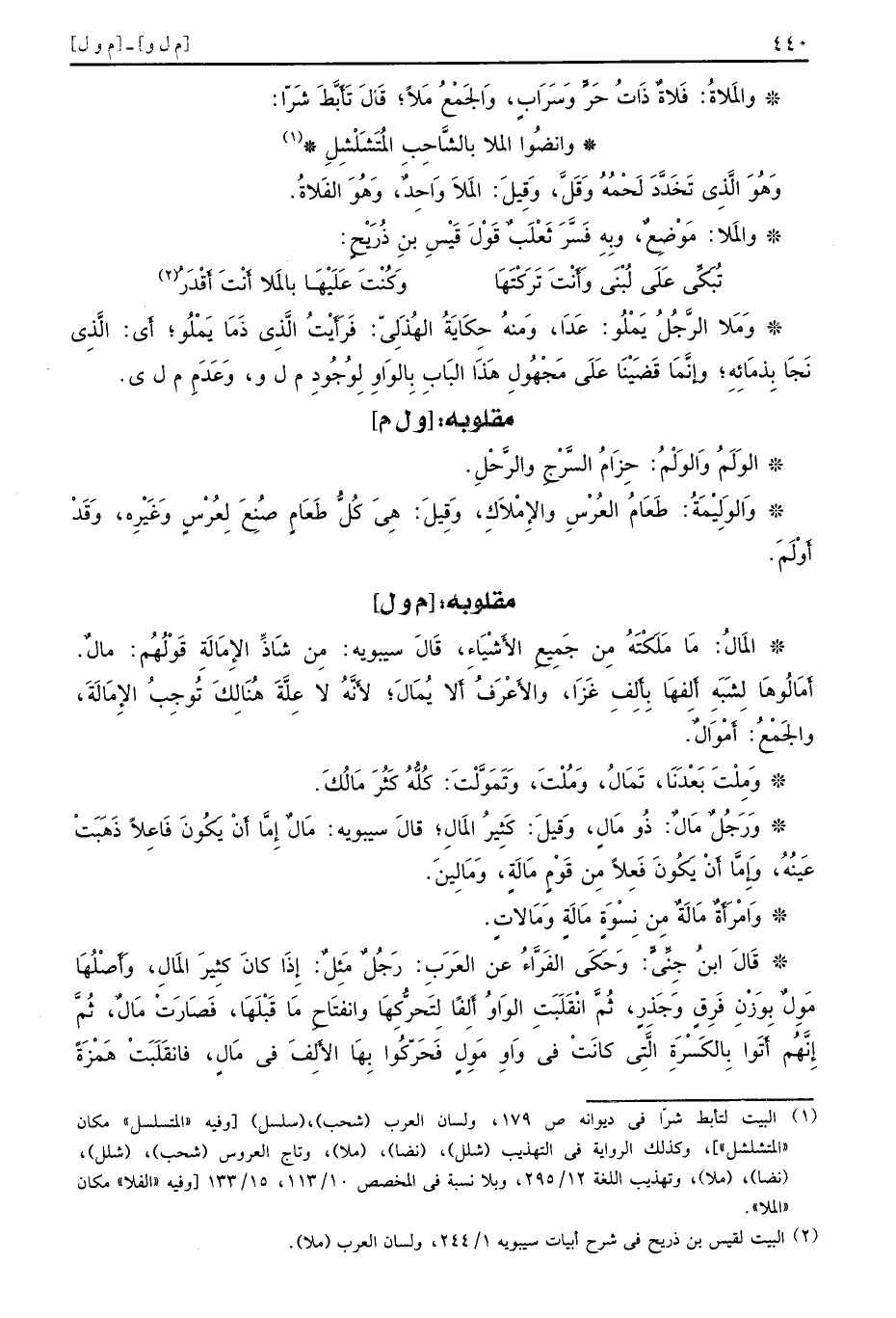 [م ول] المَالُ مَا مَلَكْتَهُ مِن جَمِيعِ الأَشْيَاءِ قَالَ سيبويه مِن شَاذِّ الإِمَالَةِ قَوْلُهُم مالٌ أَمَالُوهَا لِشَبَهِ أَلِفَها بِأَلِفِ غَزَا والأَعْرَفُ أَلا يُمَالَ لأَنَّهُ لا عِلَّةَ هُنَالِكَ تُوجِبُ الإِمَالَةَ والجَمْعُ أَمْوَالٌ وَمِلْتَ بَعْدَنَا تَمَالُ وَمُلْتَ وَتَمَوَّلْتَ كُلُّهُ كَثُرَ مَالُكَ وَرَجُلٌ مَالٌ ذُو مَالٍ وَقيلَ كَثِيرُ المَالِ قالَ سيبويه مَالٌ إِمَّا أَنْ يَكُونَ فَاعِلاً ذَهَبَتْ عَينُهُ وَإِمَّا أَنْ يَكُونَ فَعِلاً مِن قَوْمٍ مَالَةٍ وَمَالِينَ وَامْرَأَةٌ مَالَةٌ مِن نِسْوَةٍ مَالَةٍ وَمَالاتٍ قَالَ ابنُ جِنِّيٍّ وَحَكَى الفَرَّاءُ عن العَرَبِ رَجُلٌ مَثِلٌ إِذَا كانَ كثِيرَ المَالِ وَأَصْلُهَا مَوِلٌ بِوَزْنِ فَرِقٍ وَجَذِرٍ ثُمَّ انْقَلَبَتِ الوَاوُ أَلِفًا لِتَحرُّكِهَا وانفتَاحِ مَا قَبْلَهَأ فَصَارَتْ مَالٌ ثُمَّ إِنَّهُم أَتَوا بِالكَسْرَةِ الَّتِي كانَتْ في وَاوِ مَوِلٍ فَحَرّكُوا بِهَا الألِفَ في مَالٍ فانقَلَبَتْ هَمْزَةً