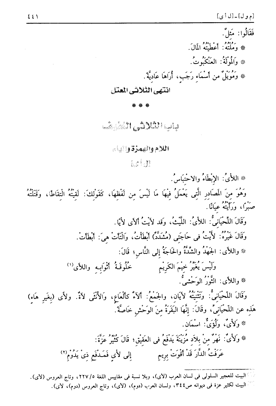 [ل أي] اللأْيُ الإِبْطَاءُ والاحْتِبَاسُ وَهُوَ مِنَ المَصَادِرِ الَّتِي يَعْمَلُ فِيْهَا مَا لَيْسَ مِن لَفْظِهَا كَقَوْلِكَ لَقِيْتُهُ الْتِقَاطًا وَقَتَلْتُهُ صَبْرًا وَرَأَيْتُهُ عِيَانًا وَقَالَ اللِّحْيَانِيُّ اللأْيُ اللَّيْثُ وَقد لأيْتُ ألأَى لأْيًا وَقَالَ غَيْرُهُ لأَيْتُ في حَاجَتِي مُشَدَّدٌ أَبْطَأْتُ وَالْتَأَتْ هِيَ أَبْطَأَتْ واللأَي الجَهْدُ والشِّدَّةُ والحَاجَةُ إِلى النَّاسِ قَالَ