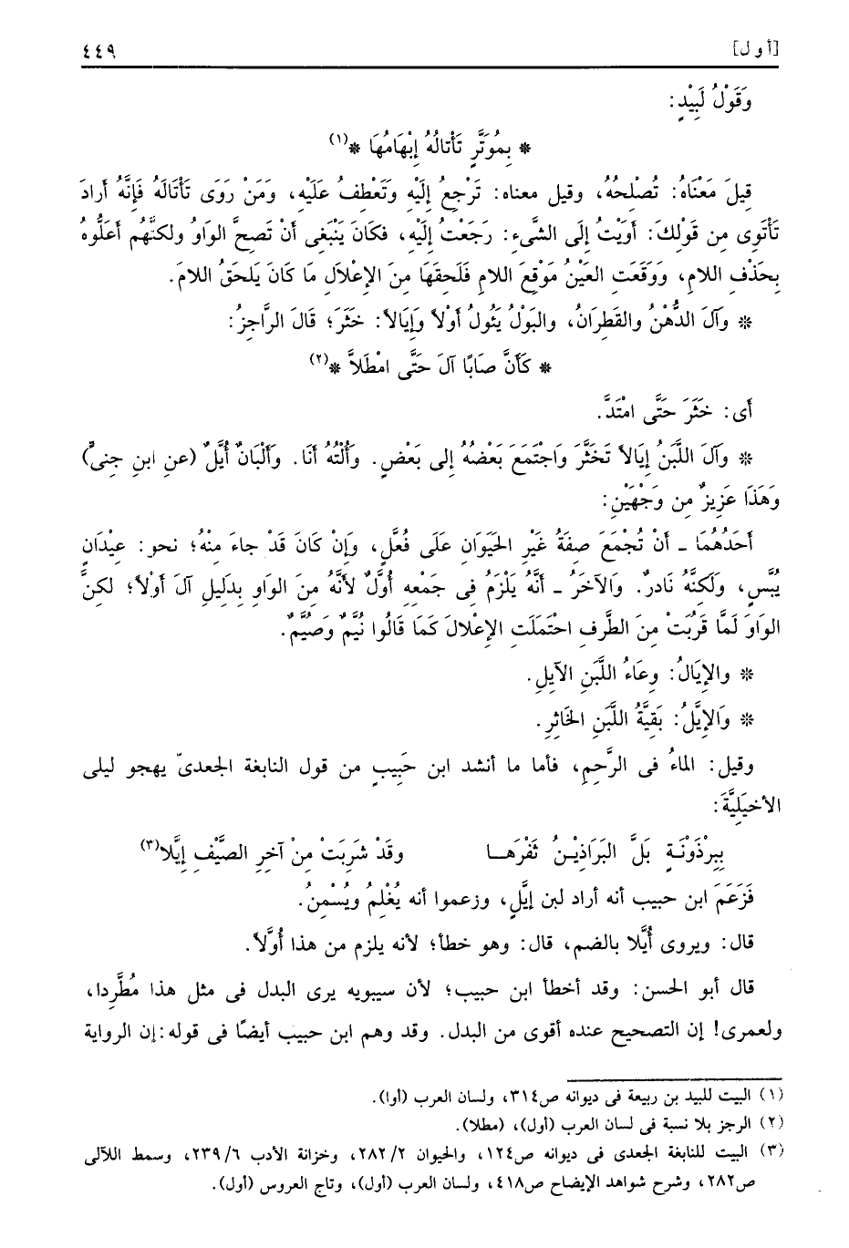 فَزَعَمَ ابن حبيب أنه أراد لبن إيَّلٍ وزعموا أنه يُغْلِمُ ويُسْمِنُ قال ويروى أُيَّلا بالضم قال وهو خطأ لأنه يلزم من هذا أُوَّلاً قال أبو الحسن وقد أخطأ ابن حبيب لأن سيبويه يرى البدل في مثل هذا مُطَّرِدا ولعمرى إن التصحيح عنده أقوى من البدل وقد وهم ابن حبيب أيضًا في قوله إن الرواية