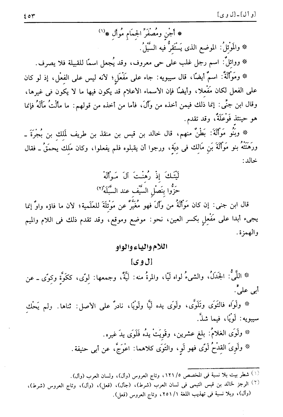 والمَوْئِلُ الموضع الذي يَسْتَقِرُّ فيه السَّيْلُ ووائِلٌ اسم رجل غلب على حي معروف وقد يُجعل اسمًا للقبيلة فلا يصرف ومَوْأَلَةٌ اسمٌ أيضًا قال سيبويه جاء على مَفْعَلٍ لأنه ليس على الفِعْلِ إذ لو كان على الفعل لكان مَفْعِلا وأيضًا فإن الأسماء الأعلام قد يكون فيها ما لا يكون في غيرها وقال ابن جنِّي إنما ذلك فيمن أخذه من وَأَلَ فأما من أخذه من قولهم ما مأَلْتُ مَأْلَةُ فإنما هو حينئذٍ فَوْعَلَةٌ وقد تقدم وبَنُو مَوْأَلَةَ بَطْنٌ منهم قال خالد بن قيس بن منقذ بن طريف لمَلِكِ بن بُجْرَةَ ورَهَنَتْهُ بنو مَوْأَلَةَ بنِ مَالِك في دِيَةٍ ورجوا أن يقبلوا فلم يفعلوا وكان مَلِك يحمَقُ فقال خالد