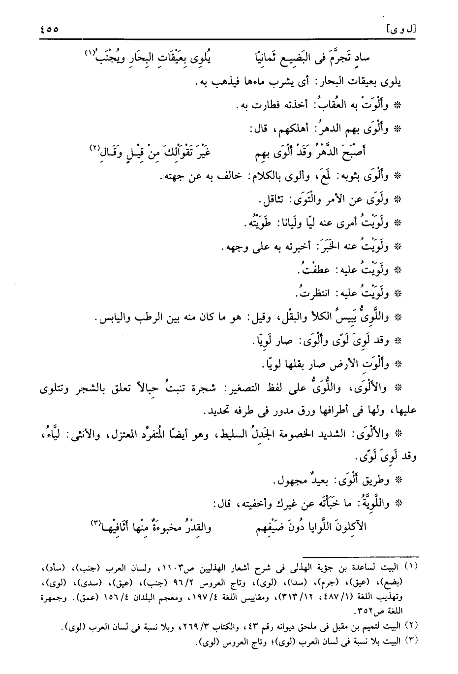 وَأَلْوَى بثوبه لمَعَ وألوى بالكلام خالف به عن جهته وَلَوَى عن الأمر والْتَوَى تثاقل ولَوَيْتُ عنه الخَبَرَ أخبرته به على وجهه وَلَوَيْتُ عليه عطفْتُ ولَوَيْتُ عليه انتظرتُ واللَّوِيُّ يَبِيسُ الكلأ والبقْل وقيل هو ما كان منه بين الرطب واليابس وقد لَوِيَ لَوًى وأَلْوَى صار لَوِيّا وأَلْوَتِ الأرض صار بقلها لويّا والأَلْوَى واللُّوَيُّ على لفظ التصغير شجرة تنبتُ حِبالاً تعلق بالشجر وتتلوى عليها ولها في أطرافها ورق مدور في طرفه تحديد والأَلْوَى الشديد الخصومة الجَدِلُ السليط وهو أيضًا المُتفرِّد المعتزل والأنثى ليَّاءُ وقد لَوِيَ لَوًى وطريق أَلْوَى بعيدٌ مجهول واللَّوِيَّةُ ما خَبَأْتَه عن غيرك وأخفيته قال