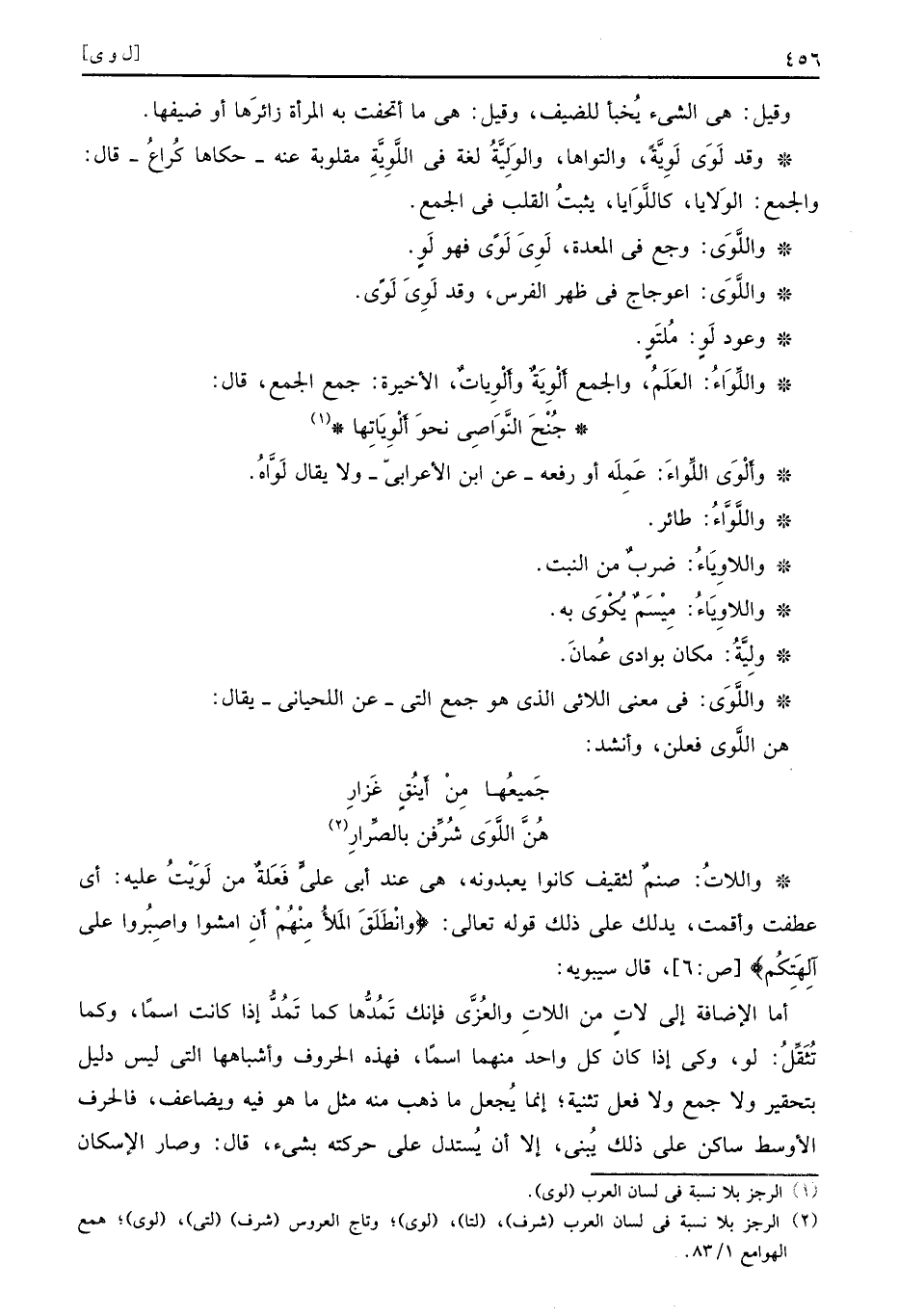 وقيل هي الشيء يُخبأ للضيف وقيل هي ما أتحفت به المرأة زائرَها أو ضيفها وقد لَوَى لَوِيَّةً والتواها والوَلِيَّةُ لغة في اللَّوِيَّةِ مقلوبة عنه حكاها كُراعُ قال والجمع الوَلايا كاللَّوَايا يثبتُ القلب في الجمع واللَّوَى وجع في المعدة لَوِيَ لَوًى فهو لَوٍ واللَّوَى اعوجاج في ظهر الفرس وقد لَوِيَ لَوًى وعود لَوٍ مُلتَوٍ واللِّوَاءُ العَلَمُ والجمع أَلْوِيَةٌ وأَلْوياتٌ الأخيرة جمع الجمع قال