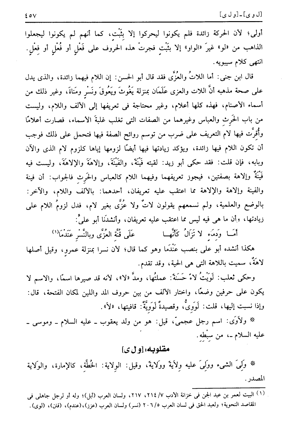 أولى لأن الحركة زائدة فلم يكونوا ليحركوا إلا بِثَبْتٍ كما أنهم لم يكونوا ليجعلوا الذاهب من لو غيرَ الواو إلا بثَبْتٍ فجرتْ هذه الحروف على فَعْلٍ أو فُعْلٍ أو فِعْلٍ انتهى كلام سيبويه قال ابن جني أما اللاتُ والعُزَّى فقد قال أبو الحسن إن اللام فيهما زائدة والذي يدل على صحة مذهبه أنَّ اللات والعزى عَلَمَان بمنزلة يَغُوثَ ويَعُوقَ ونَسْرٍ ومَناةَ وغير ذلك من أسماء الأصنام فهذه كلها أعلام وغير محتاجة في تعريفها إلى الألف واللام وليست من باب الحَرِثِ والعباس وغيرهما من الصفات التي تغلب غلبةَ الأسماء فصارت أعلامًا وأُقِرَّت فيها لام التعريف على ضرب من توسم روائح الصفة فيها فتحمل على ذلك فوجب أن تكون اللام فيها زائدة ويؤكد زيادتها فيها أيضًا لزومها إياها كلزوم لام الذي والآن وبابه فإن قلت فقد حكى أبو زيد لقيته فَيْنَةً والفَيْنَةَ وإلاهَةَ والإلاهَةَ وليست فيه فَيْنَةٌ وإلاهة بصفتين فيجوز تعريفهما وفيهما اللام كالعباس والحَرِثِ فالجواب أن فينة والفينة وإلاهة والإلاهة مما اعتقب عليه تعريفان أحدهما بالألف واللام والآخر بالوضع والعلمية ولم نسمعهم يقولون لاتٌ ولا عُزَّى بغير لام فدل لزومُ اللام على زيادتها وأن ما هي فيه ليس مما اعتقب عليه تعريفان وأنشدَنا أبو عليٍّ