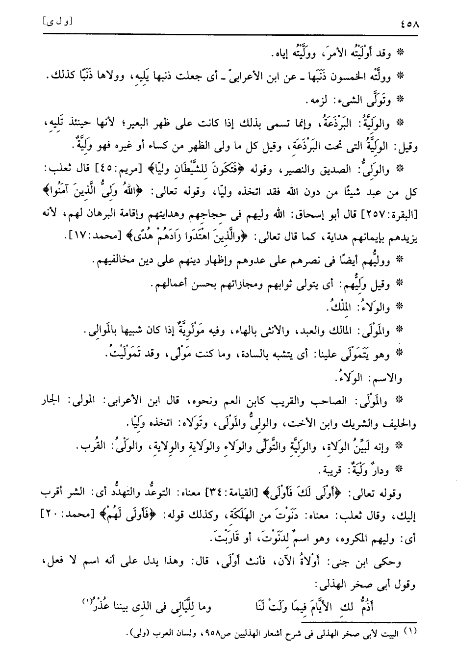 وقد أَوْلَيْتُه الأمرَ ووَلَّيْتُه إياه وولَّتْه الخمسون ذَنَبَها عن ابن الأعرابيّ أي جعلت ذنبها يَلِيَه وولاها ذَنَبًا كذلك وتَوَلَّى الشيء لزمه والوَلِيَّةُ البَرْذَعَةُ وإنما تسمى بذلك إذا كانت على ظهر البعير لأنها حينئذ تَلِيهِ وقيل الوَلِيَّةُ التي تحت البَرْذَعَةِ وقيل كل ما ولي الظهر من كساء أو غيره فهو وَلِيَّةٌ والوَلِيُّ الصديق والنصير وقوله {فتكون للشيطان وليا} مريم 45 قالت ثعلب كل من عبد شيئًا من دون الله فقد اتخذه وليّا وقوله تعالى {الله ولي الذين آمنوا} البقرة 257 قال أبو إسحاق الله وليهم في حِجاجِهم وهدايتهم وإقامة البرهان لهم لأنه يزيدهم بإيمانهم هداية كما قال تعالى {والذين اهتدوا زادهم هدى} محمد 17 ووليُّهم أيضًا في نصرهم على عدوهم وإظهار دينهم على دين مخالفيهم وقيل وَلِيُّهم أي يتولى ثوابهم ومجازاتهم بحسن أعمالهم والوَلاءُ المِلْكُ والمَوْلَى المالك والعبد والأنثى بالهاء وفيه مَوْلَوِيَّةٌ إذا كان شبهها بالمَوالِي وهو يتَمَولَى علينا أي يتشبه بالسادة وما كنت مَوْلًى وقد تَمَوْلَيْتُ والاسم الوَلاءُ والمَوْلَى الصاحب والقريب كابن العم ونحوه قال ابن الأعرابي المولى الجار والحليف والشريك وابن الأخت والولِيُّ والمَوْلَى وتَوَلاه اتخذه وَلِيّا وإنه لَبيِّنُ الوَلاةِ والوَلِيَّةِ والتَّوَلِّي والوَلاءِ والوَلايةِ والوِلايةِ والوَلْيُ القُرب ودارٌ وَلْيَةٌ قريبة وقوله تعالى {أولى لك فأولى} القيامة 34 معناه التوعُّد والتهدُّد أي الشر أقرب إليك وقال ثعلب معناه دَنَوْتَ من الهَلَكَةِ وكذلك قوله {فأولى لهم} محمد 20 أي وليهم المكروه وهو اسمٌ لِدَنَوْتَ أو قَارَبْتَ وحكى ابن جني أَوْلاةٌ الآن فأنث أَوْلى قال وهذا يدل على أنه اسم لا فعل وقول أبي صخر الهذلي