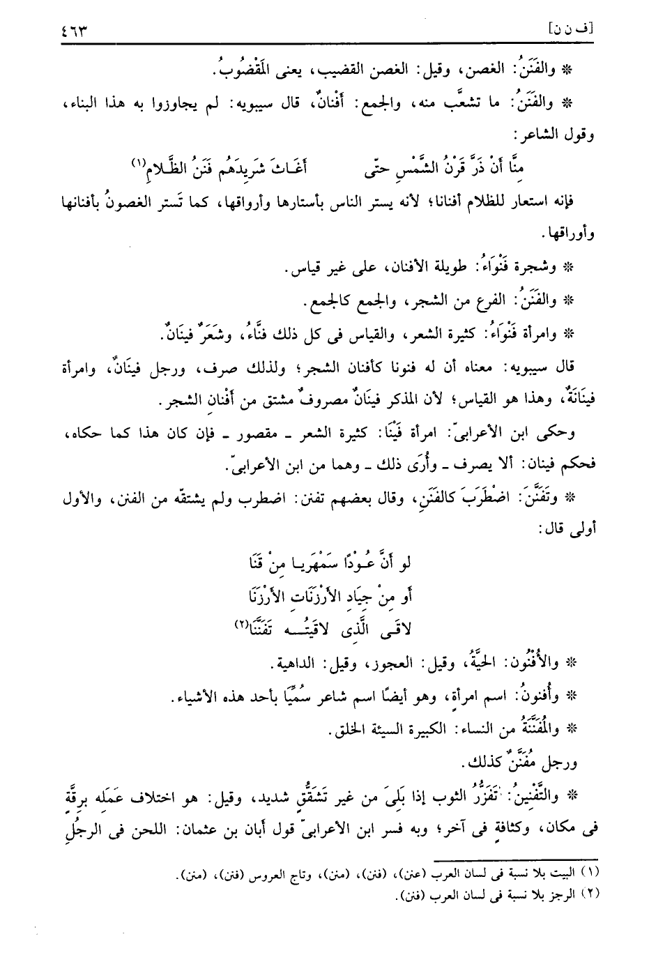 والأُفنُون الحيَّةُ وقيل العجوز وقيل الداهية وأُفنونُ اسم امرأةٍ وهو أيضًا اسم شاعر سُمِّيَا بأحد هذه الأشياء والمُفَنَّنَةُ من النساء الكبيرة السيئة الخلق ورجل مُفَنَّنٌ كذلك والتَّفْنِينُ تَفَرُّزُ الثوب إذا بَلِيَ من غير تَشَقُّقٍ شديد وقيل هو اختلاف عَمَلِه برِقَّةٍ في مكان وكثافةٍ في آخر وبه فسر ابن الأعرابيّ قول أَبان بن عثمان اللحن في الرجُلِ
