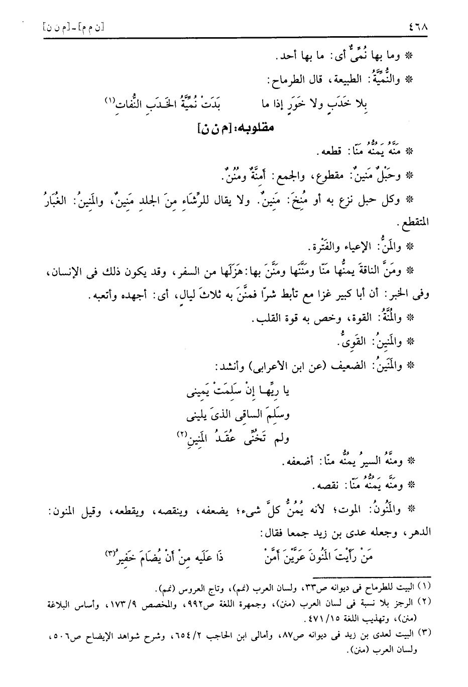 [م ن ن] مَنَّهُ يَمُنُّهُ مَنّا قطعه وحَبْلٌ مَنينٌ مقطوع والجمع أَمِنَّةٌ ومُنُنٌ وكل حبل نزع به أو مُنِخَ مَنِينٌ ولا يقال للرِّشَاءِ مِنَ الجلدِ مَنِينٌ والمَنينُ الغُبَارُ المتقطع والمَنُّ الإعياء والفَتْرة ومَنَّ الناقةَ يمنُّها مَنّا ومَنَّنَها ومَنَّنَ بها هَزَلَها من السفر وقد يكون ذلك في الإنسان وفي الخبر أن أبا كبير غزا مع تأبط شرًا فمنَّنَ به ثلاثَ ليالٍ أي أجهده وأتعبه والمُنَّةُ القوة وخص به قوة القلب والمَنِينُ القَوِيُّ والمَنَينُ الضعيف عن ابن الأعرابي وأنشد