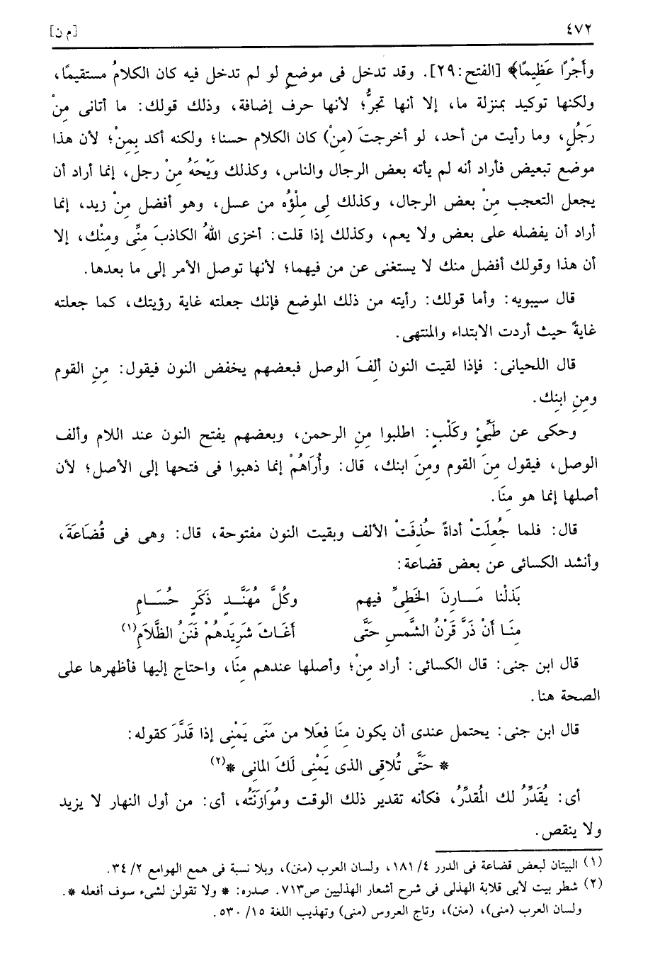 قال ابن جني قال الكسائي أراد مِنْ وأصلها عندهم مِنّا واحتاج إليها فأظهرها على الصحة هنا قال ابن جني يحتمل عندي أن يكون مِنَا فِعَلا من مَنَى يَمْنِي إذا قَدَّرَ كقوله