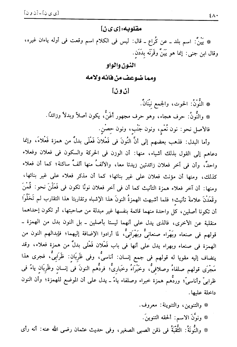 [ن ون] النُّوْنُ الحوت والجمع نِيْنَانٌ والنُّونُ حرف هجاء وهو حرف مجهور أَغَنُّ يكون أصلاً وبدلاً وزائدًا فالأصل نحو نون نُعْمٍ ونون جَنْبٍ ونون حِصْنٍ وأما البدل فذهب بعضهم إلى أَنَّ النُونَ في فَعْلانَ فَعْلَى بدلٌ من همزة فَعْلاءَ وإنما دعاهم إلى القول بذلك أشياء منها أن الوزن في الحركة والسكون في فعلان وفعلاء واحدٌ وأن في آخر فعلان زائدتين زيدتا معا والألفُ منها ألفٌ ساكنة كما أن فعلاء كذلك ومنها أن مؤنث فعلان على غير بنائها كما أن مذكر فعلاء على غير بنائها ومنها أن آخر فعلاء همزة التأنيث كما أن في آخر فعلان نونًا تكون في فَعَلْنَ نحو قُمْنَ وقَعَدْنَ علامةَ تأنيثٍ فلما أشبهت الهمزةُ النونَ هذا الإشباه وتقاربتا هذا التقارب لم تَخْلُوَا أن تكونا أصلين كل واحدة منهما قائمة بنفسها غير مبدلة من صاحبتها أو تكون إحداهما منقلبة عن الأخرى فالذي يدل على أنهما ليستا بأصلين بل النون بدل من الهمزة قولهم في صنعاء وبَهْراء صنعانِيُّ وبَهْرَانِيُّ لما أرادوا الإضافة إليهما فإبدالهم النون من الهمزة في صنعاء وبهراء يدل على أنها في باب فَعْلان فَعْلى بدلٌ من همزة فعلاء وقد ينضاف إليه مقويا له قولهم في جمع إنسان أناسيُّ وفي ظَرِبَانٍ ظَرَابِيُّ فجرى هذا مَجْرَى قولهم صلفاءُ وصلافِيُّ وخَبْرَاءُ وخَبارِيُّ فردُّهم النونَ في إنسانٍ وظَرِبَانٍ ياءً في ظرابيّ وأناسيّ وردُّهم همزة خبراء وصلفاء ياءً يدل على أن الموضع للهمزة وأن النون داخلة عليها والتنوين والتنوينة معروف ونوَّنَ الاسم ألحقه التنوينَ والنُّونَةُ الثُّقْبَةُ في ذقن الصبي الصغير وفي حديث عثمان رضي الله عنه أنه رأى
