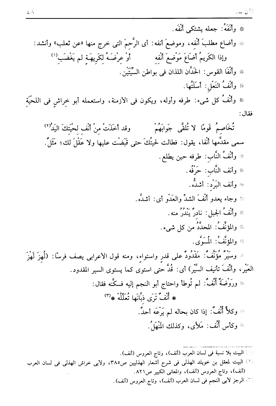 سمى مقدَّمها أَنْفا يقول فطالت لحيتُكَ حتى قَبَضْت عليها ولا عَقْلَ لك مَثَلٌ وأَنْفُ النَّابِ طرفه حين يطلع وأنف النَّابِ حَرْفُه وأنف البَرْدِ أشدُّه وجاء يعدو أَنْفَ الشدِّ والعَدْو أي أشدَّه وأَنْفُ الجبل نادِرٌ يَنْدُرُ منه والمؤنَّفُ المحدَّدُ من كل شيء والمؤنَّفُ المُسَوَّى وسَيْرٌ مُؤَنَّفٌ مَقْدُودٌ على قدرٍ واستواءٍ ومنه قول الأعرابي يصف فرسًا لُهِزَ لَهْزَ العَيْر وَأنِّفَ تأنيف السَّيْر أي قُدَّ حتى استوى كما يستوي السير المقدود ورَوْضَةٌ أُنُفٌ لم تُوطأ واحتاج أبو النجم إليه فسكَّنه فقال