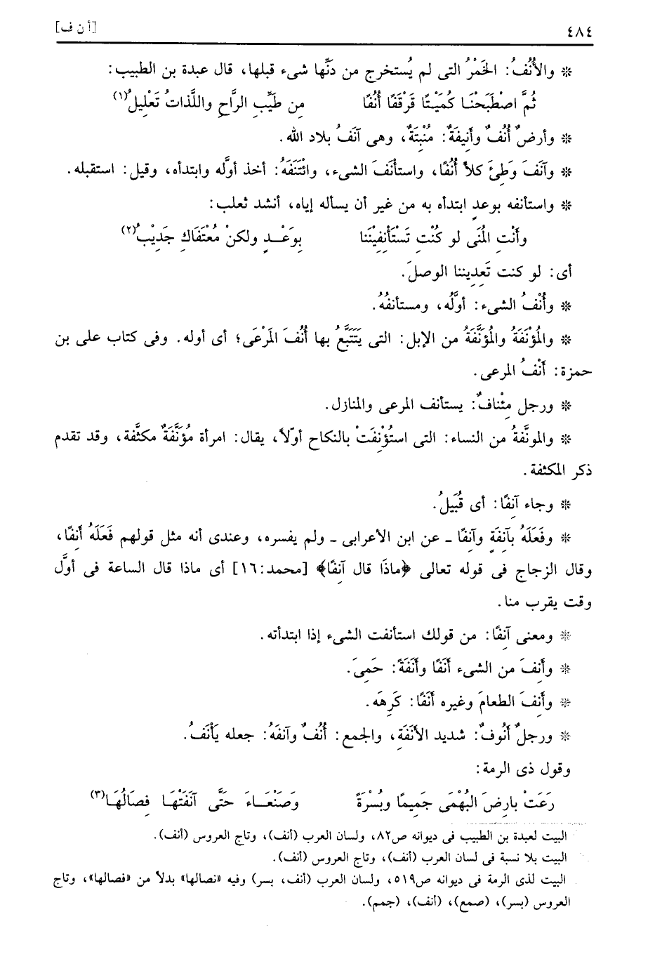 أي لو كنت تَعِدِيننا الوصلَ وأُنْفُ الشيء أَوَّلُه ومستأنفُهُ والمُؤْنَفَةُ والمُؤَنَّفَةُ من الإبل التي يَتَتَبَّعُ بها أُنُفَ المَرْعَى أي أوله وفي كتاب علي بن حمزة أَنْفُ المرعى ورجل مِئْنافٌ يستأنف المرعى والمنازل والمونَّفةُ من النساء التي استُؤْنِفَتْ بالنكاح أوّلاً يقال امرأة مُؤَنَّفَةٌ مكثَّفة وقد تقدم ذكر المكثفة وجاء آنِفًا أي قَبَيلُ وفَعَلَهُ بآنِفَةٍ وآنِفًا عن ابن الأعرابي ولم يفسره وعندي أنه مثل قولهم فَعَلَهُ أَنِفًا وقال الزجاج في قوله تعالى {ماذا قال آنفا} محمد 16 أي ماذا قال الساعة في أوَّل وقت يقرب منا ومعنى آنِفًا من قولك استأنفت الشيء إذا ابتدأته وأَنِفَ من الشيء أَنَفًا وأَنَفَةً حَمِيَ وأَنِفَ الطعامَ وغيره أَنَفًا كَرِهَه ورجلٌ أَنُوفٌ شديد الأَنَفَةِ والجمع أُنُفٌ وآنَفَهُ جعله يَأْنَفُ وقول ذي الرمة
