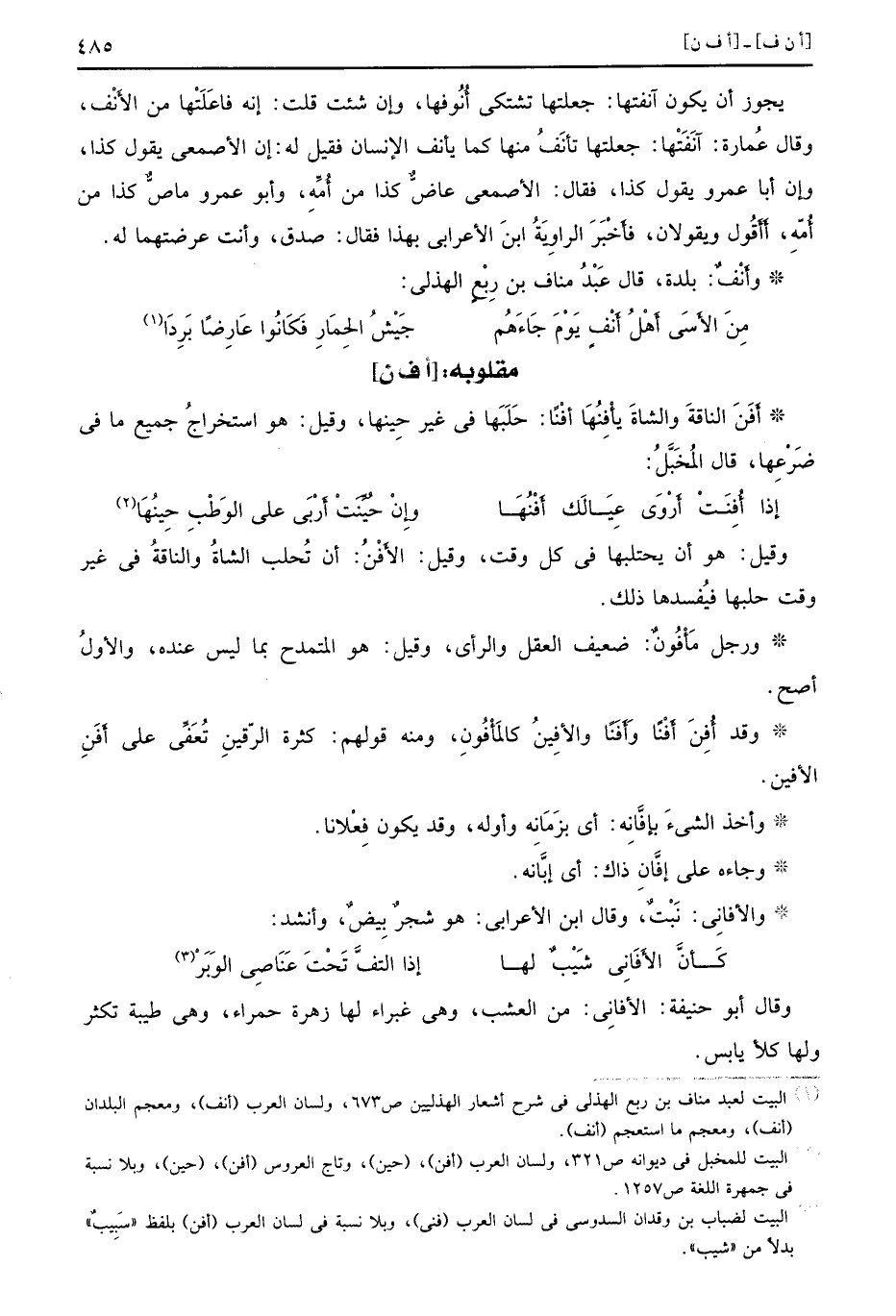 وقيل هو أن يحتلبها في كل وقت وقيل الأَفْنُ أن تُحلب الشاةُ والناقةُ في غير وقت حلبها فيُفسدها ذلك ورجل مَأْفُونٌ ضعيف العقل والرأي وقيل هو المتمدح بما ليس عنده والأولُ أصح وقد أُفِنَ أَفْنًا وَأَفَنًا والأفِينُ كالمَأْفُونِ ومنه قولهم كثرة الرّقينِ تُعَفِّي على أَفَنِ الأفين وأخذ الشيءَ بإفَّانِه أي بزَمَانِه وأوله وقد يكون فِعْلانا وجاءه على إفَّانِ ذاك أي إبَّانه والأفانِي نَبْتٌ وقال ابن الأعرابي هو شجرٌ بِيضٌ وأنشد