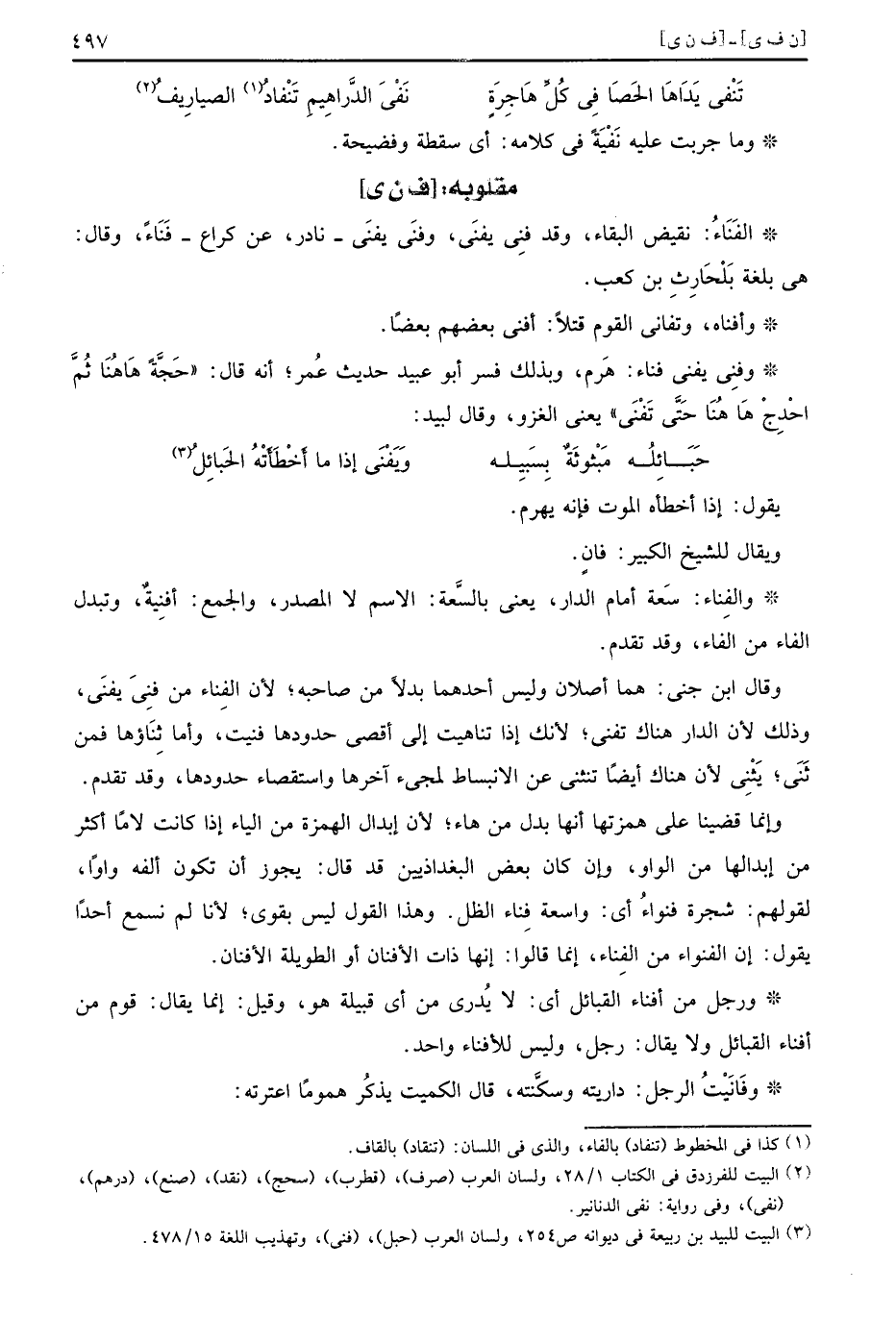 يقول إذا أخطأه الموت فإنه يهرم ويقال للشيخ الكبير فانٍ والفِناء سَعة أمام الدار يعني بالسَّعة الاسم لا المصدر والجمع أفنِيةٌ وتبدل الفاء من الفاء وقد تقدم وقال ابن جني هما أصلان وليس أحدهما بدلاً من صاحبه لأن الفِناء من فِنيَ يفنَى وذلك لأن الدار هنا تفنى لأنك إذا تناهيت إلى أقصى حدودها فنيت وأما ثِنَاؤها فمن ثَنَى يَثْنِي لأن هناك أيضًا تنثني عن الانبساط لمجيء آخرها واستقصاء حدودها وقد تقدم وإنما قضينا على همزتها أنها بدل من هاء لأن إبدال الهمزة من الياء إذا كانت لامًا أكثر من إبدالها من الواو وإن كان بعض البغداذيين قد قال يجوز أن تكون ألفه واوًا لقولهم شجرة فنواءُ أي واسعة فِناء الظل وهذا القول ليس بقوي لأنا لم نسمع أحدًا يقول إن الفنواء من الفِناء إنما قالوا إنها ذات الأفنان أو الطويلة الأفنان ورجل من أفناء القبائل أي لا يُدري من أي قبيلة هو وقيل إنما يقال قوم من أفناء القبائل ولا يقال رجل وليس للأفناء واحد وفَانَيْتُ الرجل داريته وسكَّنته قال الكميت يذكُر همومًا اعترته