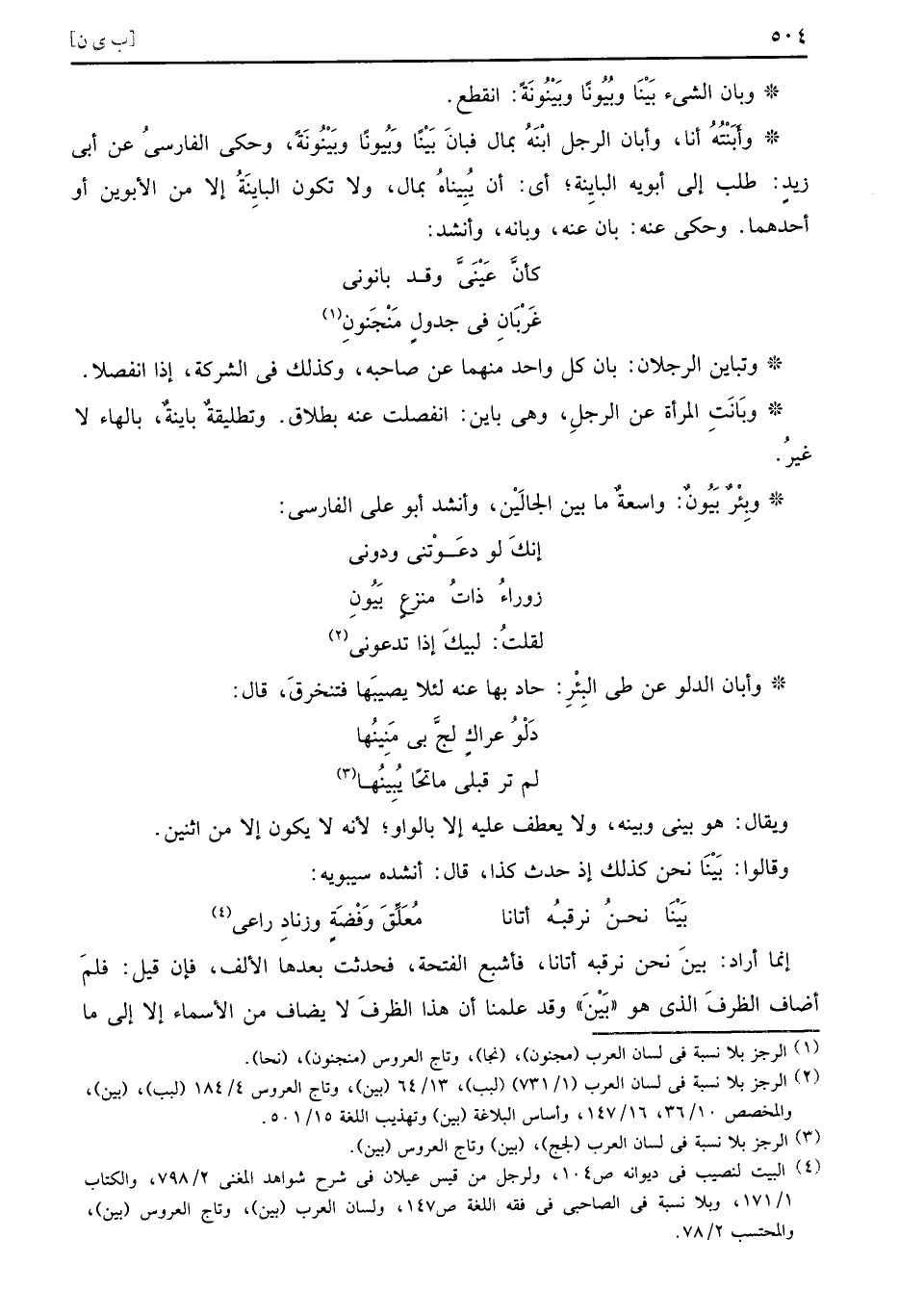 وتباين الرجلان بان كل واحد منهما عن صاحبه وكذلك في الشركة إذا انفصلا وبَانَتِ المرأة عن الرجلِ وهي باين انفصلت عنه بطلاق وتطليقةٌ باينةٌ بالهاء لا غيرُ وبِئْرٌ بَيُونٌ واسعةٌ ما بين الجالَيْن وأنشد أبو علي الفارسي