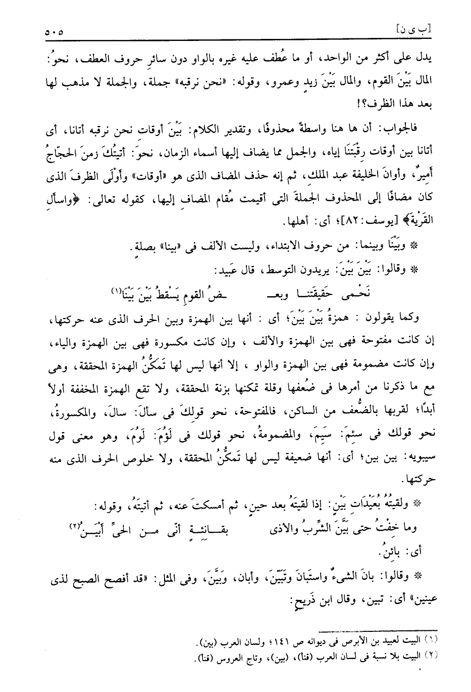 يدل على أكثر من الواحد أو ما عُطف عليه غيره بالواو دون سائرِ حروف العطف نحوُ المال بَيْنَ القوم والمال بَيْنَ زيدٍ وعمرو وقوله نحن نرقبه جملة والجملة لا مذهب لها بعد هذا الظرف فالجواب أن ها هنا واسطةً محذوفًا وتقدير الكلام بَيْنَ أوقاتِ نحن نرقبه أتانا أي أتانا بين أوقات رِقْبَتَنا إياه والجمل مما يضاف إليها أسماء الزمان نحوَ أتيتُكَ زمنَ الحجّاجُ أمِيرٌ وأوانَ الخليفة عبد الملكِ ثم إنه حذف المضاف الذي هو أوقات وأَوْلَى الظرفَ الذي كان مضافًا إلى المحذوف الجملةَ التي أقيمت مُقام المضافِ إليها كقوله تعالى {واسأل القرية} يوسف 82 أي أهلها وبَيْنَا وبينما من حروف الابتداء وليست الألف في بينا بصلةٍ وقالوا بَيْنَ بَيْنَ يريدون التوسط قال عَبيد
