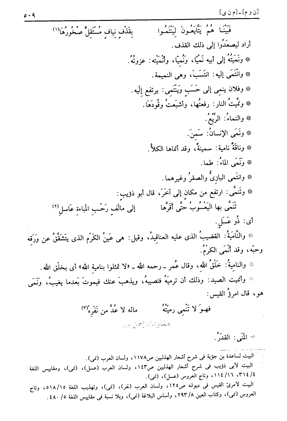 أراد ليصعَدُوا إلى ذلك القذف ونَمَيتُهُ إلى أبيه نَمْيًا وَنُمِيّا وأَنْمَيْته عزوتُهُ وانْتَمَى إليه انتَسَبَ وهي النميمة وفلان ينمِي إلى حَسَبٍ ويَنْتَمِي يرتفع إِلَيه ونمَّيتُ النار رفعتُها وأشبَعتُ وقُودَهَا والنماءُ الرَّيْعُ ونَمَى الإنسانُ سَمِنَ وناقَةٌ نامية سمينةٌ وقد أنماها الكلأُ وَنَمَى الماءُ طما وانتَمى البازِيُّ والصقرُ وغيرهما وتَنمَّى ارتفع من مكانٍ إلى آخَرَ قال أبو ذؤيبٍ