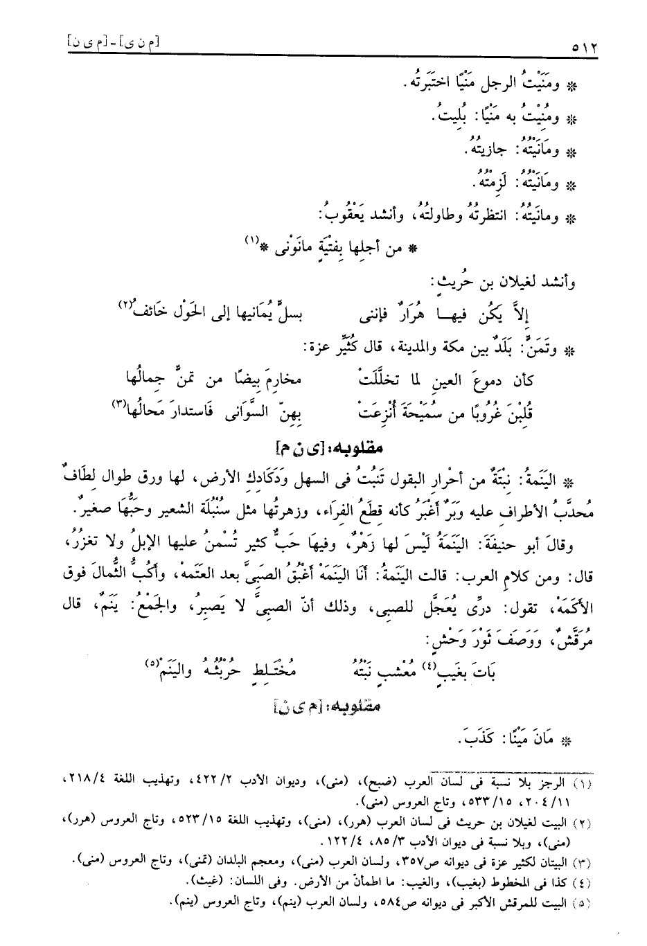 ومَنَيْتُ الرجل مَنْيًا اختَبَرتُه ومُنِيْتُ به مَنْيًا بُلِيتُ ومَانَيْتُهُ جازيتُهُ ومَانَيْتُهُ لَزِمْتُهُ ومانَيتُهُ انتظرتُهُ وطاولتُهُ وأنشد يَعْقُوبُ