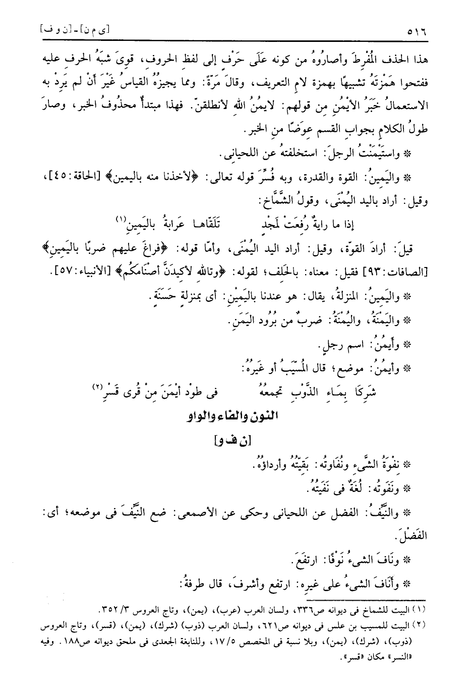 هذا الحذف المُفْرِطَ وأصارُوهُ من كونه عَلَى حَرْفٍ إلى لفظِ الحروفِ قوِيَ شبَهُ الحرفِ عليه ففتحوا هَمْزتَهُ تشبيهًا بهمزة لامِ التعريف وقالَ مَرّةً ومما يجيزُهُ القياسُ غَيْرَ أَنْ لم يَرِدْ به الاستعمالُ خَبَرُ الأيْمُنِ مِن قولهم لايمُنُ اللهِ لأنطلقنّ فهذا مبتدأٌ محذُوفُ الخبر وصارَ طولُ الكلامِ بجوابِ القسم عِوَضًا منِ الخبر واستَيْمَنْتُ الرجلَ استخلفتهُ عن اللحيانِي واليَمِينُ القوة والقدرة وبه فُسِّرَ قوله تعالى {لأخذنا منه باليمين} الحاقة 45 وقيل أراد باليد اليُمْنَى وقولُ الشَّمَّاخ